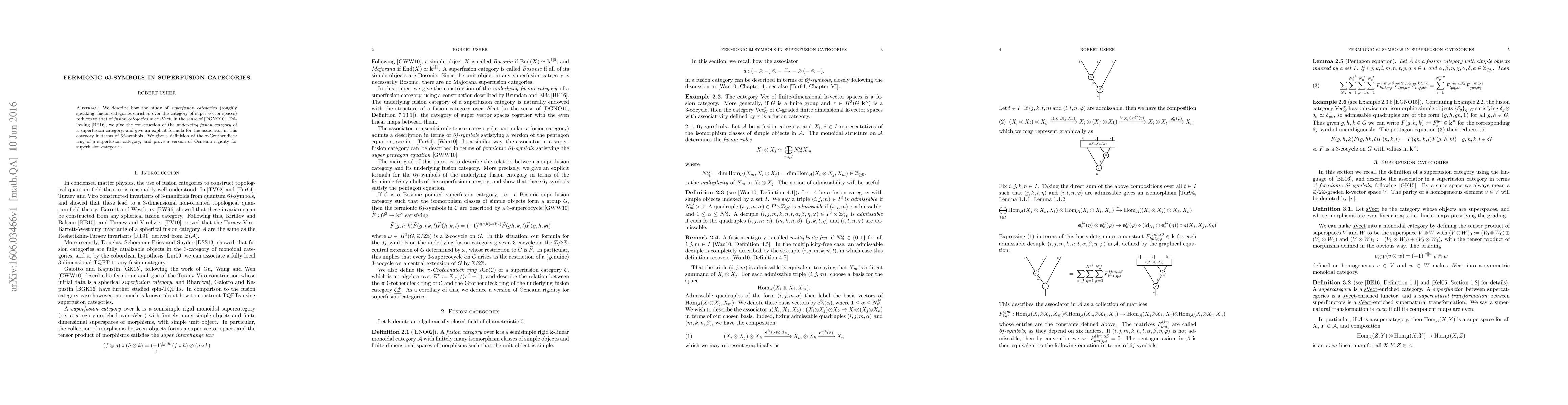 This paper explores the reduction of superfusion categories to fusion categories, constructs the underlying fusion category, and provides an explicit formula for the associator using 6$j$-symbols. It also introduces the $\pi$-Grothendieck ring for superfusion categories and proves a version of Ocneanu rigidity.