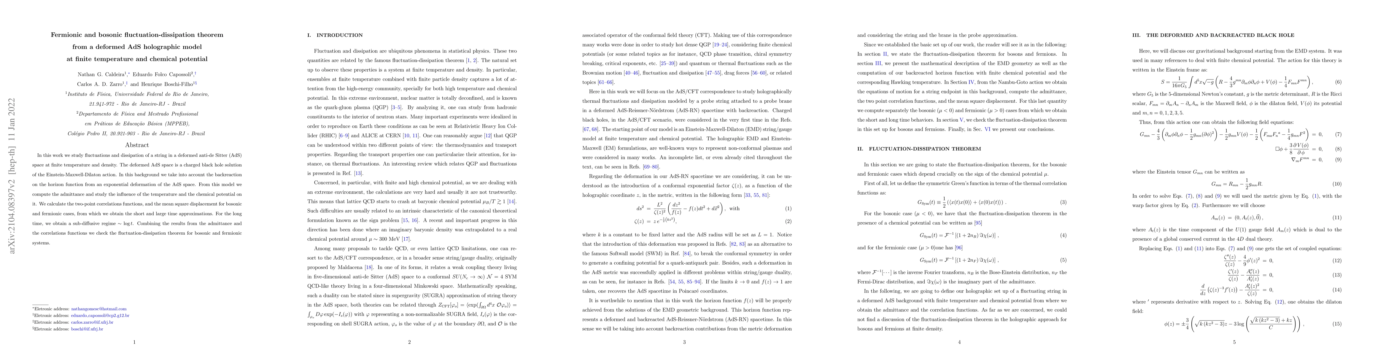 This paper investigates fluctuations and dissipation in a deformed AdS space using a holographic model at finite temperature and chemical potential. It computes admittance and correlation functions to verify the fluctuation-dissipation theorem for both bosonic and fermionic systems, revealing a sub-diffusive regime in the long time behavior.