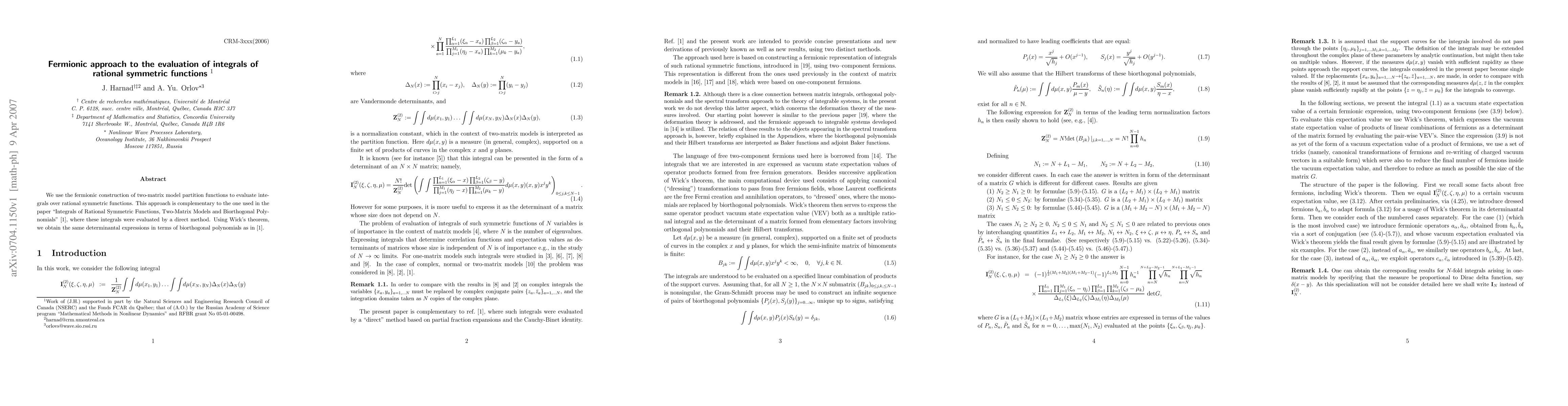 Summary: This paper employs a fermionic construction of two-matrix model partition functions to evaluate integrals of rational symmetric functions, offering a complementary approach to the direct method used in a related study. The fermionic method provides an alternative pathway for solving these integrals.