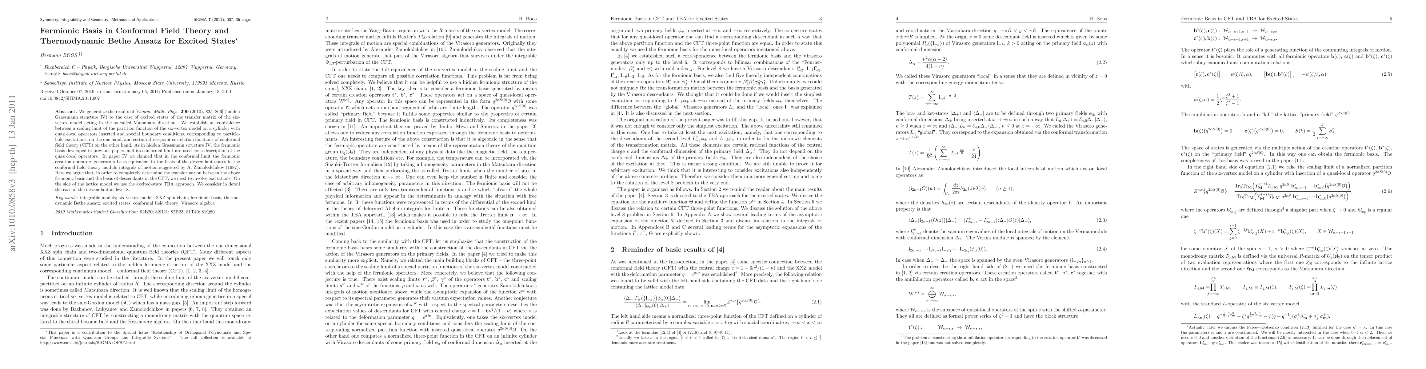 This paper generalizes the hidden Grassmann structure to excited states in the six-vertex model, establishing an equivalence between the scaling limit of the partition function with quasi-local operators and three-point correlation functions in conformal field theory. It uses a fermionic basis to describe quasi-local operators and discusses the transformation between this basis and the descendant states in CFT, emphasizing the role of excitations.