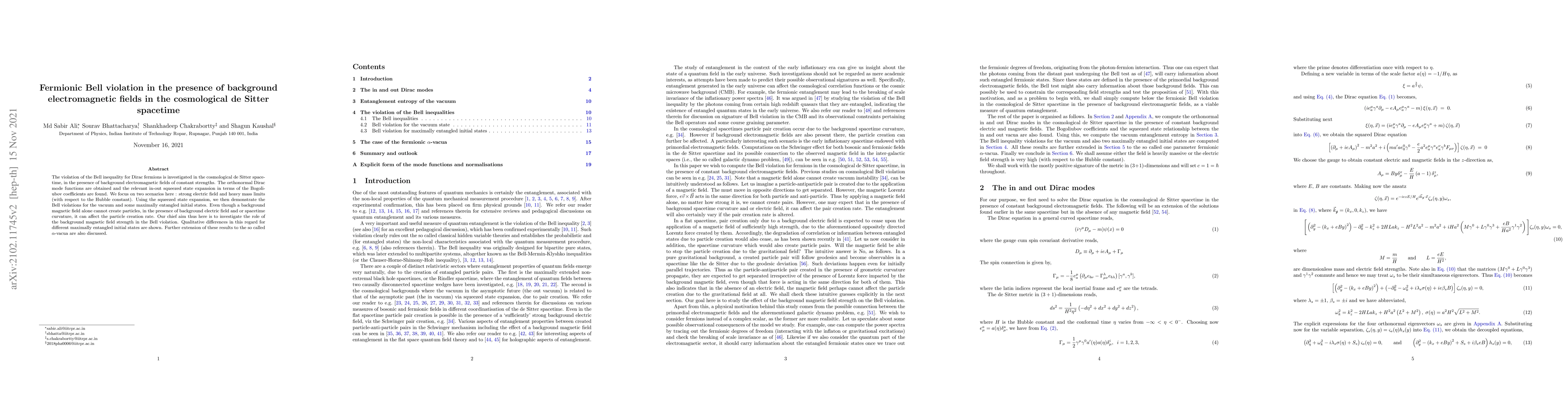 This paper investigates the Bell inequality violation for Dirac fermions in de Sitter spacetime with background electromagnetic fields, focusing on strong electric fields and heavy masses. It demonstrates Bell violations in the presence of background magnetic fields, showing qualitative differences for different maximally entangled states and extending the findings to $\alpha$-vacua.