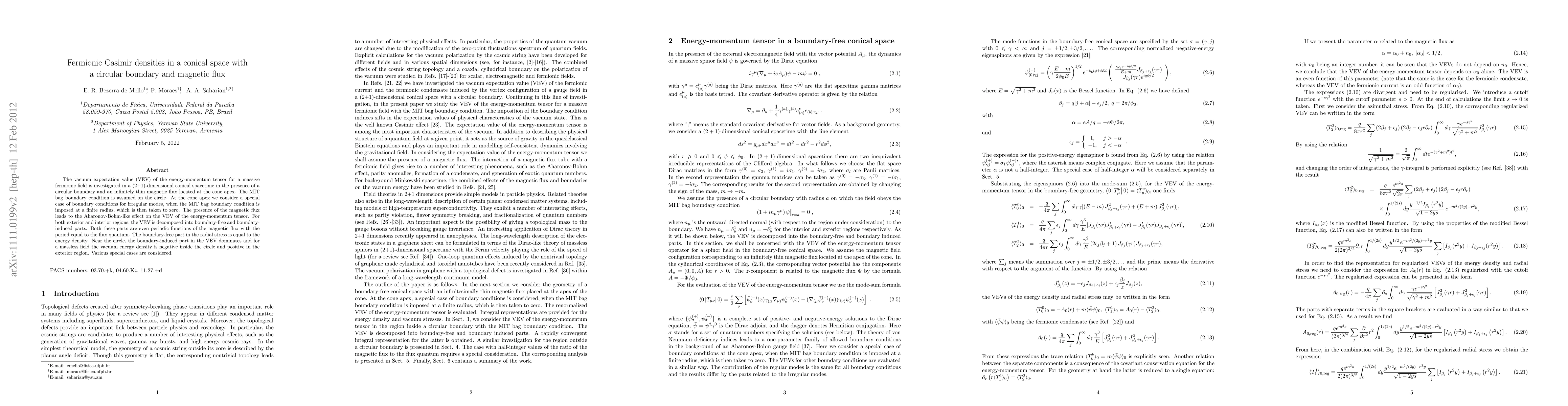 The vacuum expectation value (VEV) of the energy-momentum tensor for a massive fermionic field is investigated in a (2+1)-dimensional conical spacetime in the presence of a circular boundary and an infinitely thin magnetic flux located at the cone apex. The MIT bag boundary condition is assumed on the circle. At the cone apex we consider a special case of boundary conditions for irregular modes, when the MIT bag boundary condition is imposed at a finite radius, which is then taken to zero. The presence of the magnetic flux leads to the Aharonov-Bohm-like effect on the VEV of the energy-momentum tensor. For both exterior and interior regions, the VEV is decomposed into boundary-free and boundary-induced parts. Both these parts are even periodic functions of the magnetic flux with the period equal to the flux quantum. The boundary-free part in the radial stress is equal to the energy density. Near the circle, the boundary-induced part in the VEV dominates and for a massless field the vacuum energy density is negative inside the circle and positive in the exterior region. Various special cases are considered.