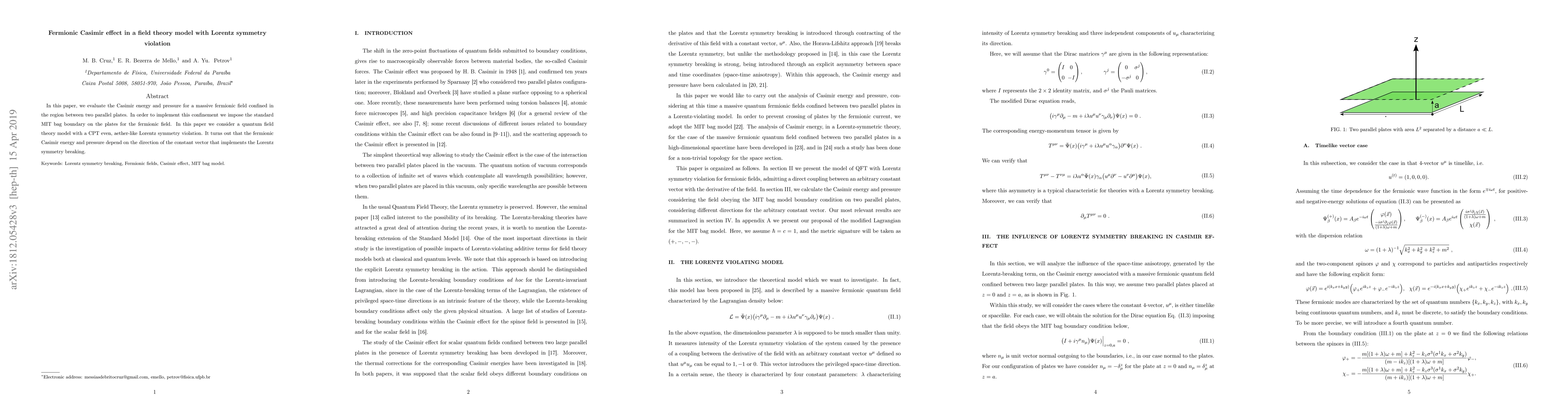 This paper evaluates the Casimir energy and pressure for a massive fermionic field with Lorentz symmetry violation in a quantum field theory model, finding that the effects depend on the direction of the symmetry-breaking vector. The MIT bag boundary conditions are applied to confine the fermionic field between two parallel plates.
