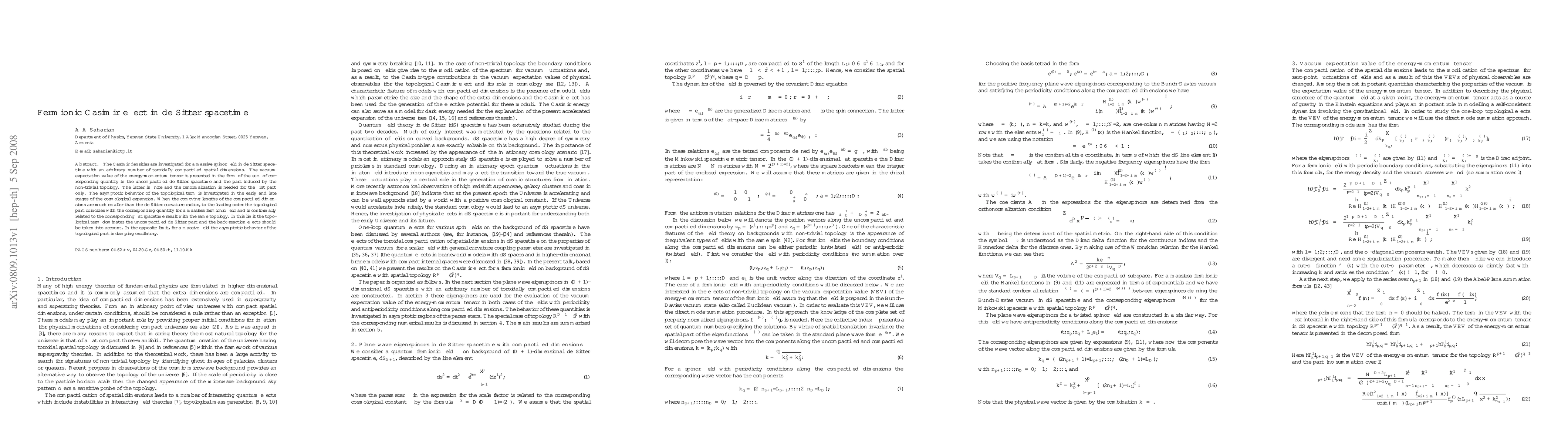 The research examines the Casimir effect for a massive spinor field in de Sitter spacetime with toroidally compactified dimensions, revealing a finite topological term that influences the vacuum energy-momentum tensor. The topological term dominates in the early expansion when compactification lengths are small, while it oscillates and dampens in the opposite limit.