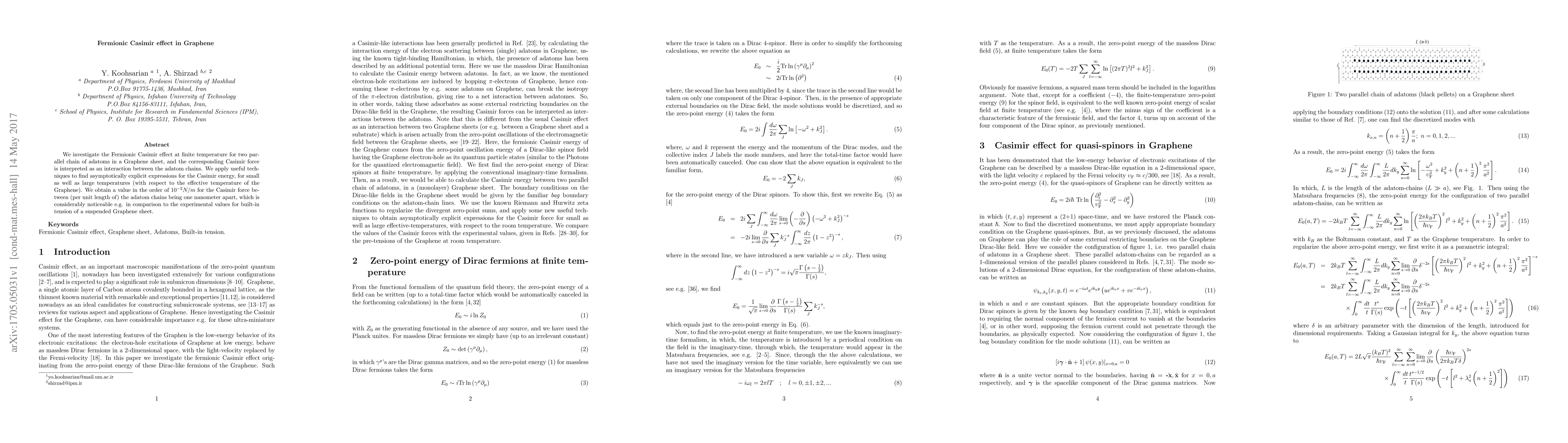 This paper investigates the Fermionic Casimir effect at finite temperature in graphene with two parallel chains of adatoms, finding an interaction force between them. The study provides explicit expressions for the Casimir energy and calculates a noticeable Casimir force of approximately $10^{-2} N/m$ for adatom chains one nanometer apart.