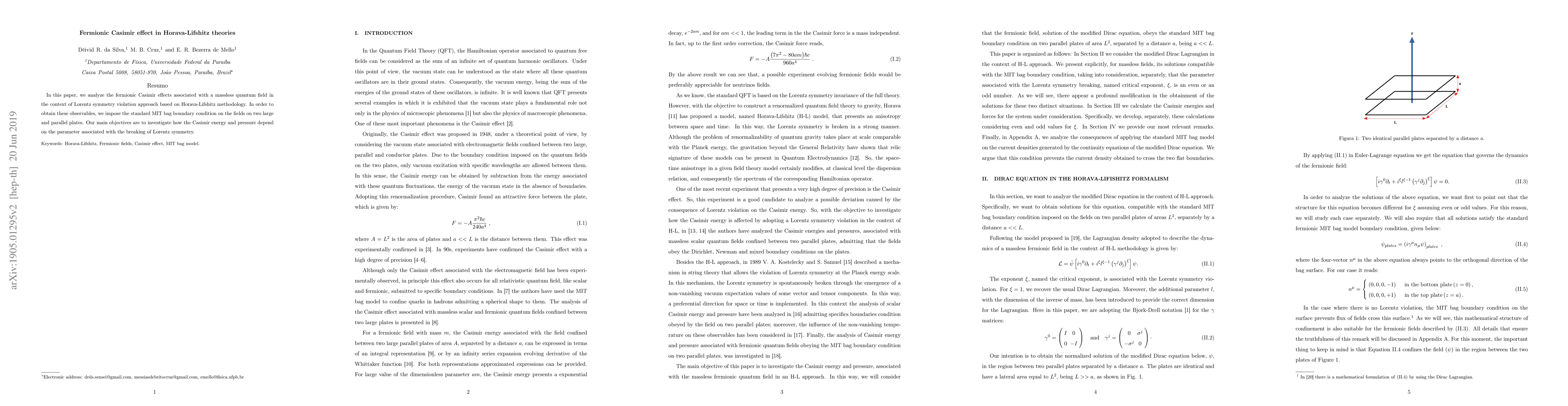 This paper investigates the fermionic Casimir effect in Horava-Lifshitz theories, focusing on how the Casimir energy and pressure vary with Lorentz symmetry violation parameters, using the MIT bag boundary condition on parallel plates.