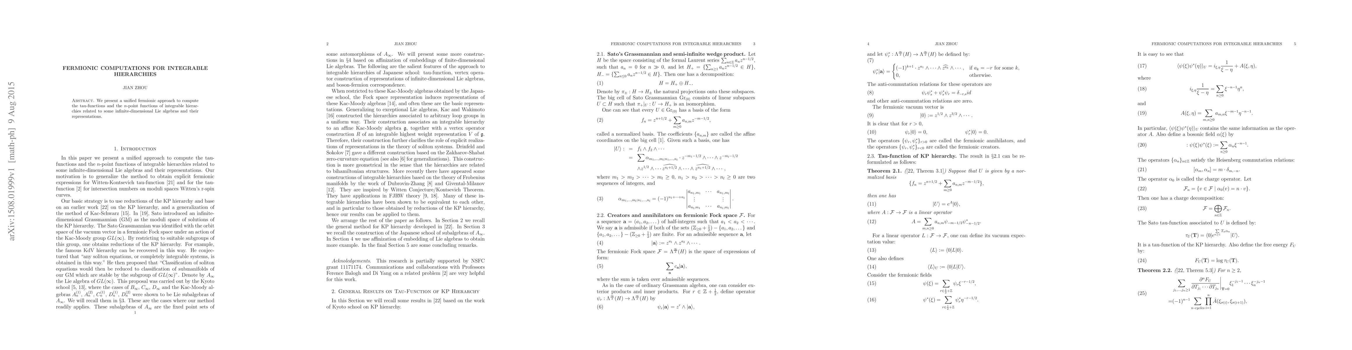 This paper introduces a fermionic method for calculating tau-functions and n-point functions in integrable systems linked to infinite-dimensional Lie algebras and their representations. The approach provides a unified framework for these computations.