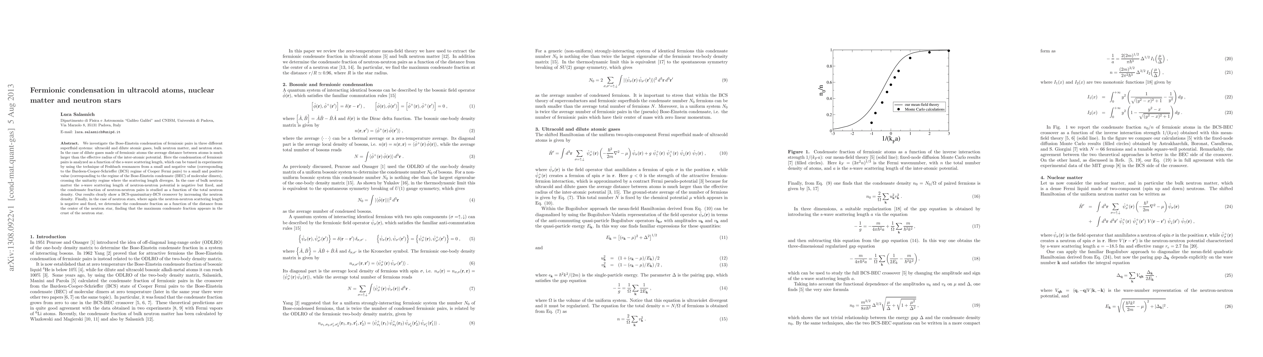 This research explores the Bose-Einstein condensation of fermionic pairs in ultracold atomic gases, bulk neutron matter, and neutron stars, highlighting a BCS-quasiunitary-BCS crossover in neutron systems and identifying the crust of neutron stars as the region with the highest condensate fraction.