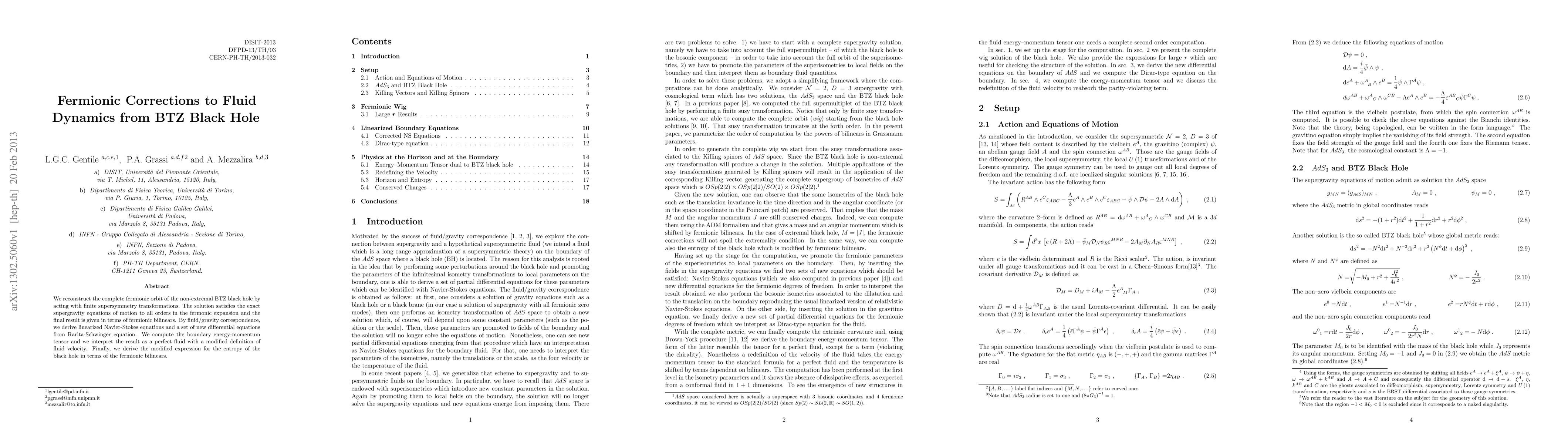 We reconstruct the complete fermionic orbit of the non-extremal BTZ black hole by acting with finite supersymmetry transformations. The solution satisfies the exact supergravity equations of motion to all orders in the fermonic expansion and the final result is given in terms of fermionic bilinears. By fluid/gravity correspondence, we derive linearized Navier-Stokes equations and a set of new differential equations from Rarita-Schwinger equation. We compute the boundary energy-momentum tensor and we interpret the result as a perfect fluid with a modified definition of fluid velocity. Finally, we derive the modified expression for the entropy of the black hole in terms of the fermionic bilinears.