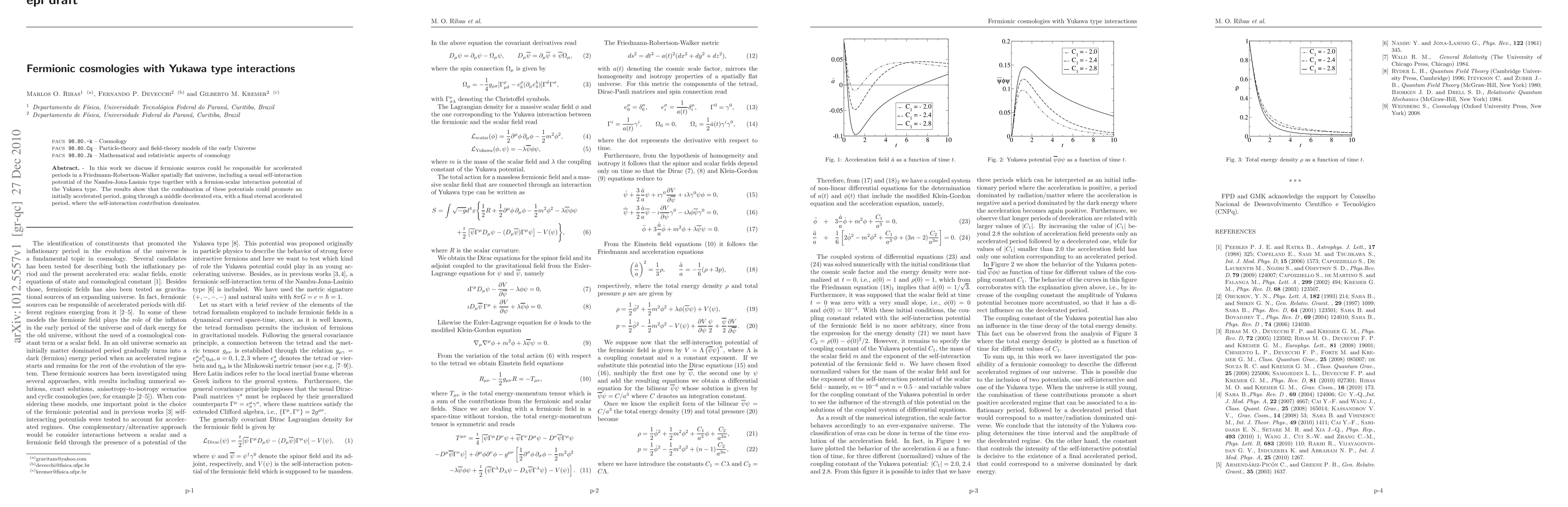In this work we discuss if fermionic sources could be responsible for accelerated periods in a Friedmann-Robertson-Walker spatially flat universe, including a usual self-interaction potential of the Nambu-Jona-Lasinio type together with a fermion-scalar interaction potential of the Yukawa type. The results show that the combination of these potentials could promote an initially accelerated period, going through a middle decelerated era, with a final eternal accelerated period, where the self-interaction contribution dominates.