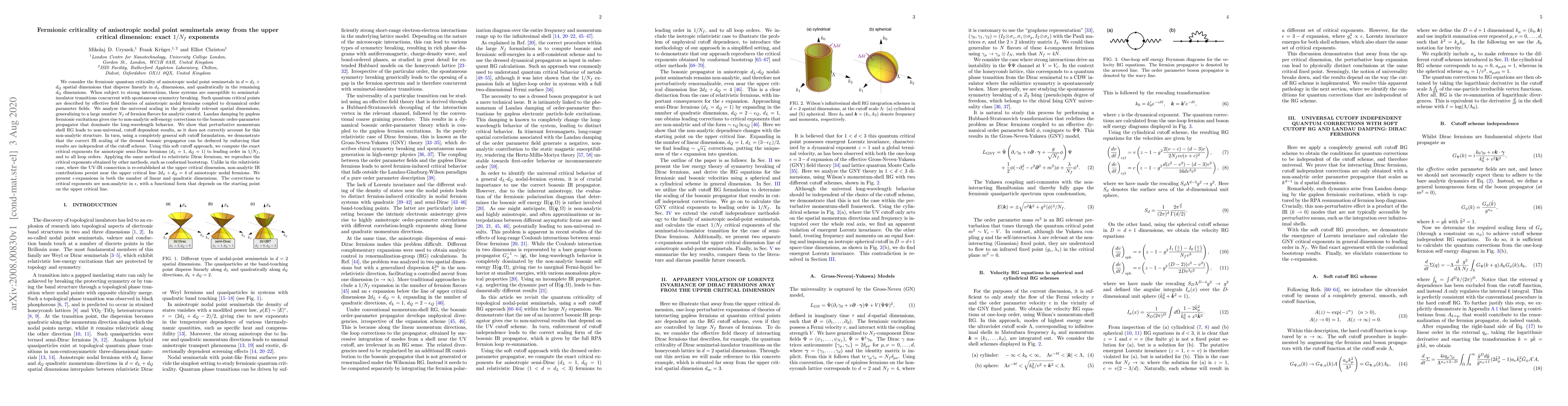 We consider the fermionic quantum criticality of anisotropic nodal point semimetals in $d = d_L + d_Q$ spatial dimensions that disperse linearly in $d_L$ dimensions, and quadratically in the remaining $d_Q$ dimensions. When subject to strong interactions, these systems are susceptible to semimetal-insulator transitions concurrent with spontaneous symmetry breaking. Such quantum critical points are described by effective field theories of anisotropic nodal fermions coupled to dynamical order parameter fields. We analyze the universal scaling in the physically relevant spatial dimensions, generalizing to a large number $N_f$ of fermion flavors for analytic control. Landau damping by gapless fermionic excitations gives rise to non-analytic self-energy corrections to the bosonic order-parameter propagator that dominate the long-wavelength behavior. We show that perturbative momentum shell RG leads to non-universal, cutoff dependent results, as it does not correctly account for this non-analytic structure. In turn, using a completely general soft cutoff formulation, we demonstrate that the correct IR scaling of the dressed bosonic propagator can be deduced by enforcing that results are independent of the cutoff scheme. Using this soft cutoff approach, we compute the exact critical exponents for anisotropic semi-Dirac fermions $(d_L=1$, $d_Q=1)$ to leading order in $1/N_f$, and to all loop orders. Applying the same method to relativistic Dirac fermions, we reproduce the critical exponents obtained by other methods, such as conformal bootstrap...