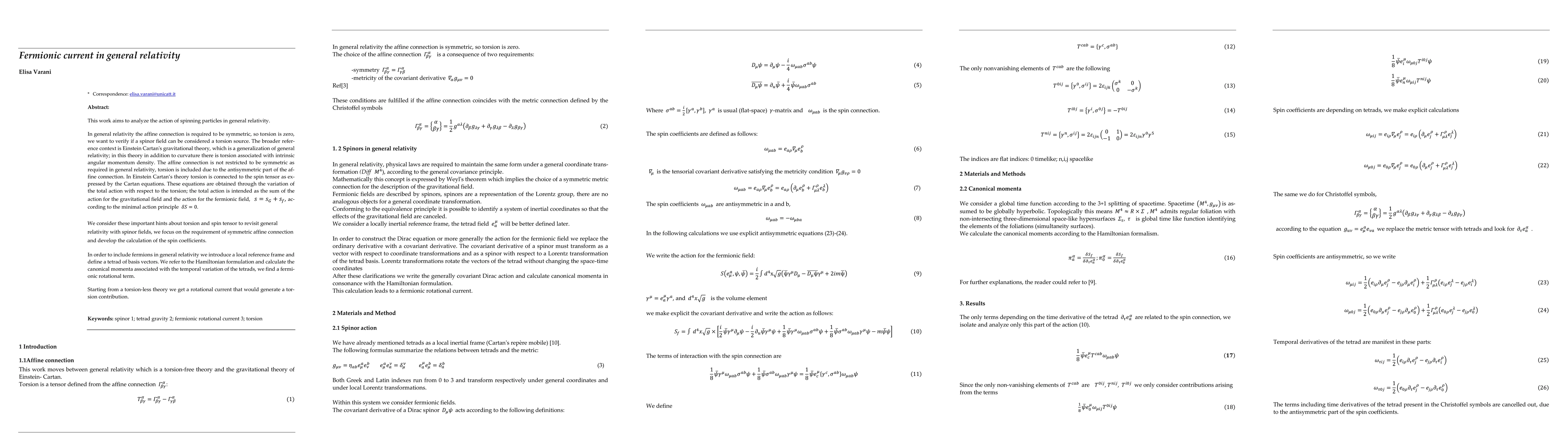 In general relativity the affine connection is required to be symmetric so torsion is zero while according to the Einsten- Cartan's theory torsion is connected to the spin tensor as expressed by the Cartan's equations. We consider the theory of spinors in general relativity in the light of the results of Einstein Cartan's theory.In general relativity the affine connection is required to be symmetric so torsion is zero while according to the Einsten- Cartan's theory torsion is connected to the spin tensor as expressed by the Cartan's equations. We consider the theory of spinors in general relativity in the light of the results of Einstein Cartan's theory. This work begins with the study of the spin connection coefficients, the calculation of the canonical momenta detects a spinor rotational current; fermionic rotational current is associated with torsion as explained by Cartan's equations, we find this torsion contribution even if the affine connection is symmetric. In the final considerations, we analyze the interaction terms (as written in the full action for Dirac spinors) and we compare them with the results of linearized gravity. We deduce that Gravitomagnetism is well described in the linearized theory while the term of spin connection giving rise to fermionic current is canceled out, so we mean these terms are describing different interactions.