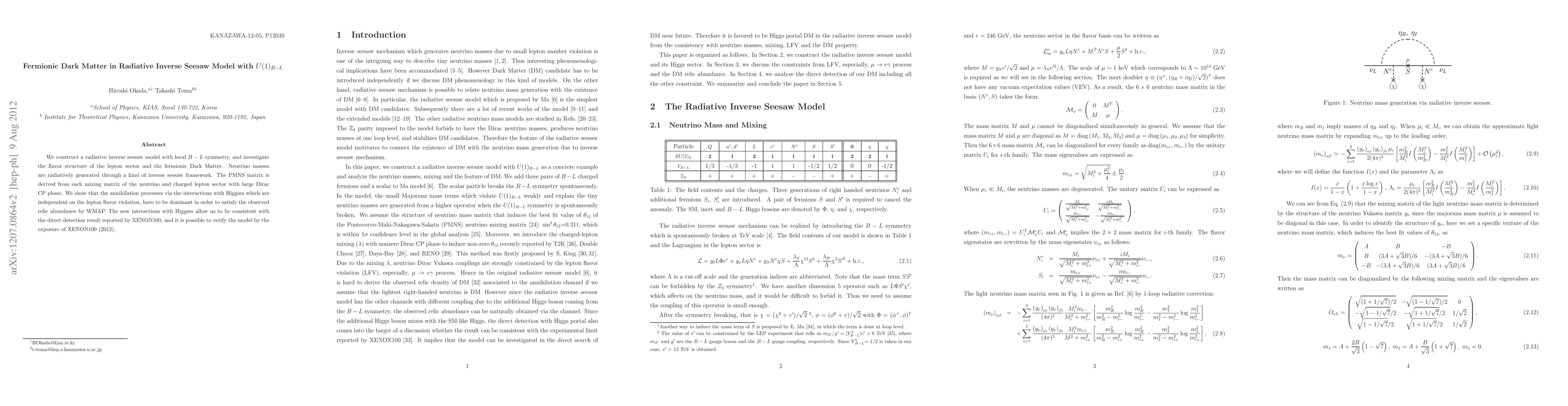 We construct a radiative inverse seesaw model with local B-L symmetry, and investigate the flavor structure of the lepton sector and the fermionic Dark Matter. Neutrino masses are radiatively generated through a kind of inverse seesaw framework. The PMNS matrix is derived from each mixing matrix of the neutrino and charged lepton sector with large Dirac CP phase. We show that the annihilation processes via the interactions with Higgses which are independent on the lepton flavor violation, have to be dominant in order to satisfy the observed relic abundance by WMAP. The new interactions with Higgses allow us to be consistent with the direct detection result reported by XENON100, and it is possible to verify the model by the exposure of XENON100 (2012).