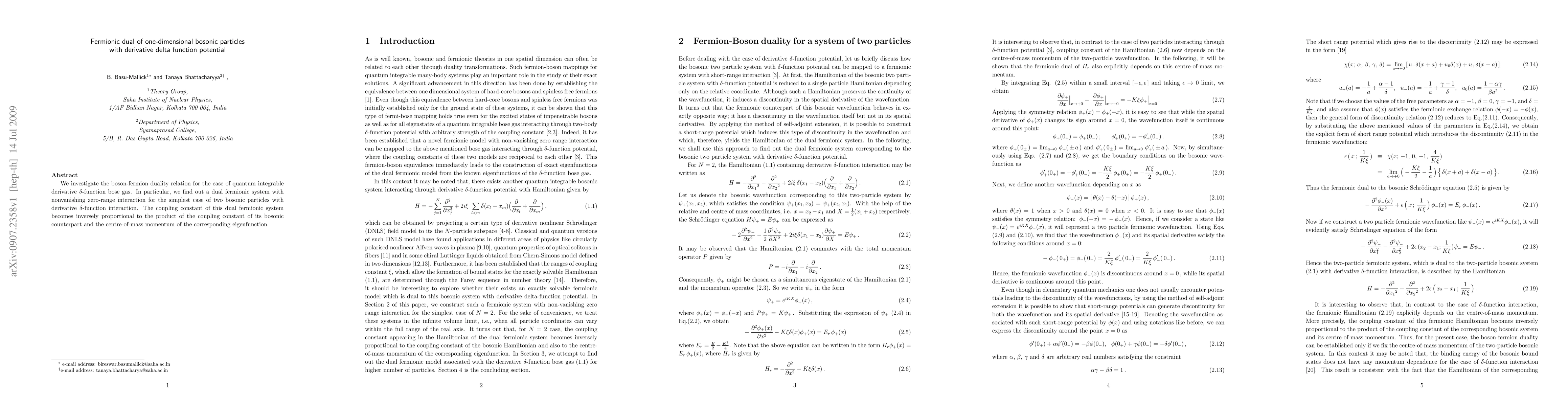 This paper explores the boson-fermion duality in a quantum integrable system of one-dimensional bosonic particles with a derivative delta function potential. It identifies a dual fermionic system with nonvanishing zero-range interaction, where the coupling constant inversely depends on the bosonic coupling constant and the center-of-mass momentum.