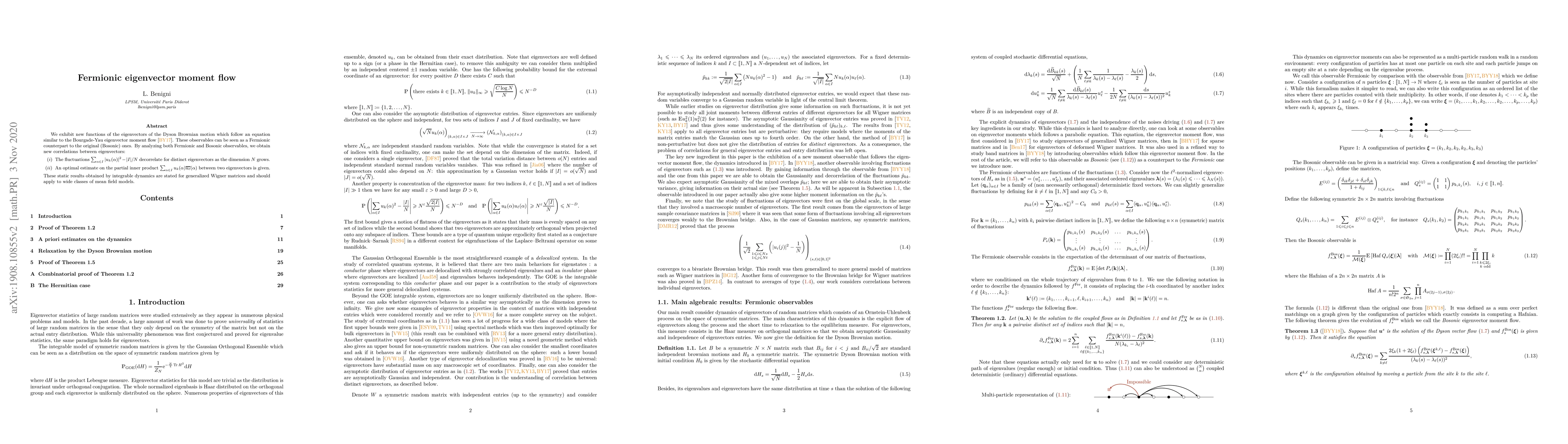 We exhibit new functions of the eigenvectors of the Dyson Brownian motion which follow an equation similar to the Bourgade-Yau eigenvector moment flow. These observables can be seen as a Fermionic counterpart to the original (Bosonic) ones. By analyzing both Fermionic and Bosonic observables, we obtain new correlations between eigenvectors. The fluctuations $\sum_{\alpha\in I}u_k(\alpha)^2-{\vert I\vert}/{N}$ decorrelate for distinct eigenvectors as the dimension $N$ grows and an optimal estimate on the partial inner product $\sum_{\alpha\in I}u_k(\alpha)u_\ell(\alpha)$ between two eigenvectors is given. These static results obtained by integrable dynamics are stated for generalized Wigner matrices and should apply to wide classes of mean field models.