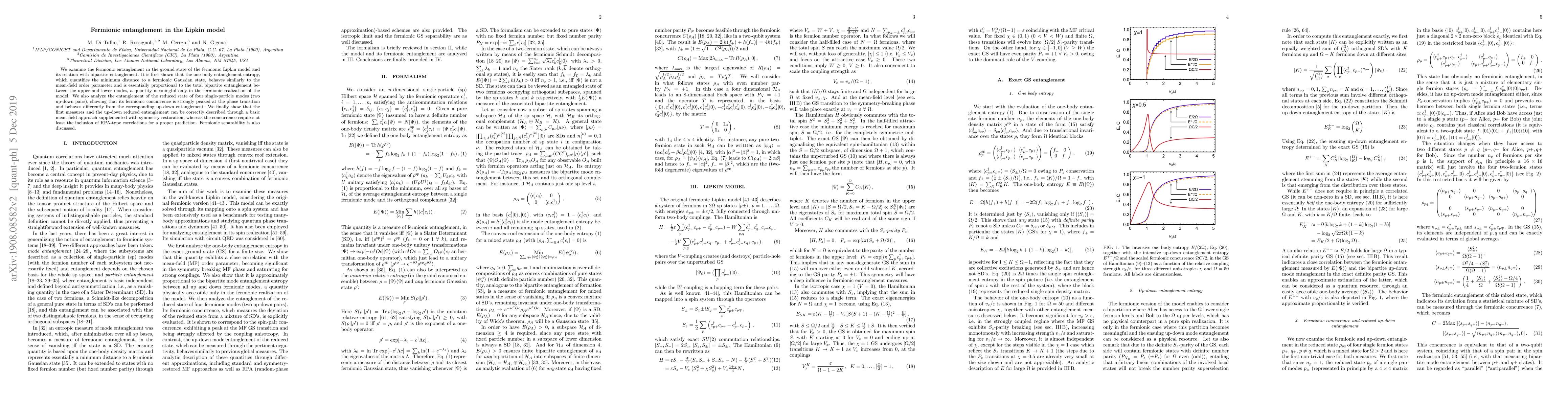 This research explores fermionic entanglement in the Lipkin model's ground state, revealing that one-body entanglement entropy mirrors the mean-field order parameter and bipartite entanglement. It also finds distinct entanglement behaviors for four single-particle modes, demonstrating that mean-field theory with symmetry restoration can describe certain entanglement measures, while RPA-type correlations are needed for others. The study also touches upon fermionic separability.