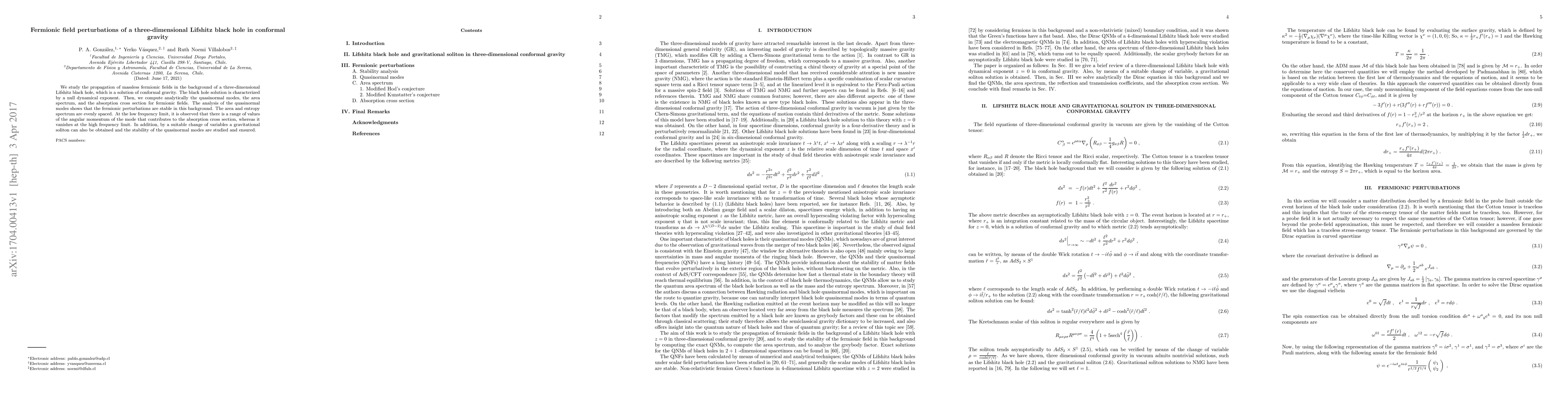 We study the propagation of massless fermionic fields in the background of a three-dimensional Lifshitz black hole, which is a solution of conformal gravity. The black hole solution is characterized by a null dynamical exponent. Then, we compute analytically the quasinormal modes, the area spectrum, and the absorption cross section for fermionic fields. The analysis of the quasinormal modes shows that the fermionic perturbations are stable in this background. The area and entropy spectrum are evenly spaced. At the low frequency limit, it is observed that there is a range of values of the angular momentum of the mode that contributes to the absorption cross section, whereas it vanishes at the high frequency limit. In addition, by a suitable change of variables a gravitational soliton can also be obtained and the stability of the quasinormal modes are studied and ensured.
