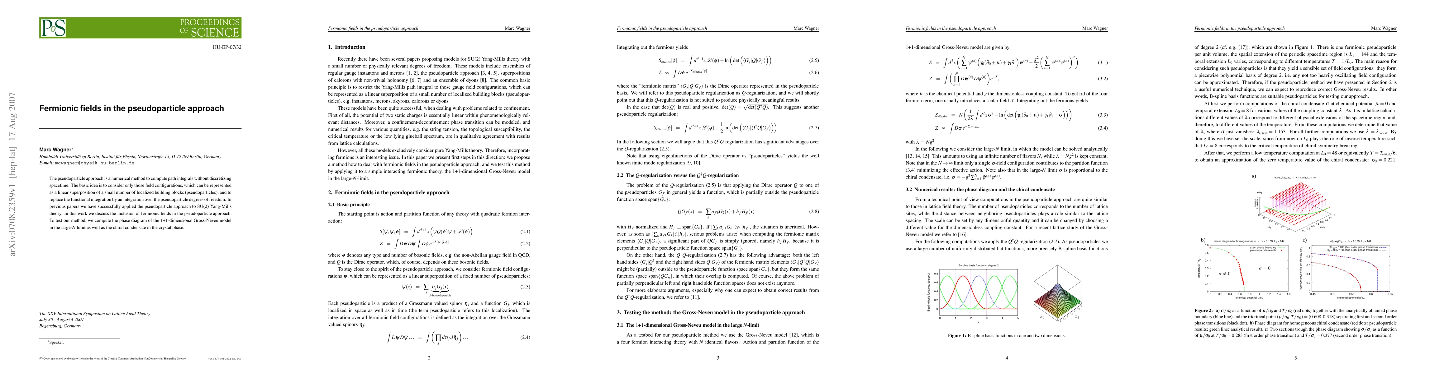 This paper explores the integration of fermionic fields into the pseudoparticle approach, a numerical method for computing path integrals without discretizing spacetime. The authors test their method by analyzing the phase diagram and chiral condensate of the 1+1-dimensional Gross-Neveu model in the large-N limit.