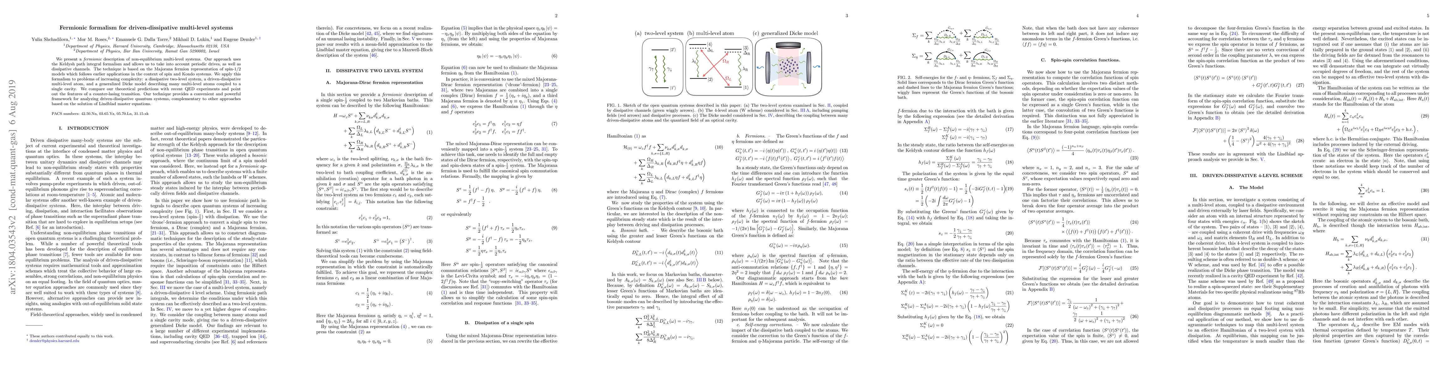 We present a fermionic description of non-equilibrium multi-level systems. Our approach uses the Keldysh path integral formalism and allows us to take into account periodic drives, as well as dissipative channels. The technique is based on the Majorana fermion representation of spin-1/2 models which follows earlier applications in the context of spin and Kondo systems. We apply this formalism to problems of increasing complexity: a dissipative two-level system, a driven-dissipative multi-level atom, and a generalized Dicke model describing many multi-level atoms coupled to a single cavity. We compare our theoretical predictions with recent QED experiments and point out the features of a counter-lasing transition. Our technique provides a convenient and powerful framework for analyzing driven-dissipative quantum systems, complementary to other approaches based on the solution of Lindblad master equations.
