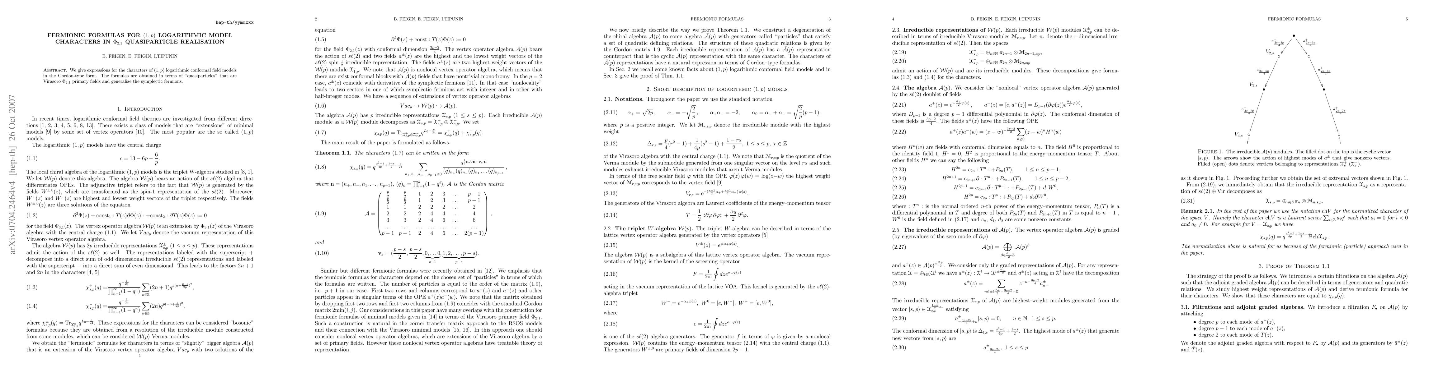 This paper provides expressions for the characters of $(1,p)$ logarithmic conformal field models in the Gordon-type form, derived using Virasoro $\Phi_{2,1}$ quasiparticles, which generalize the symplectic fermions.