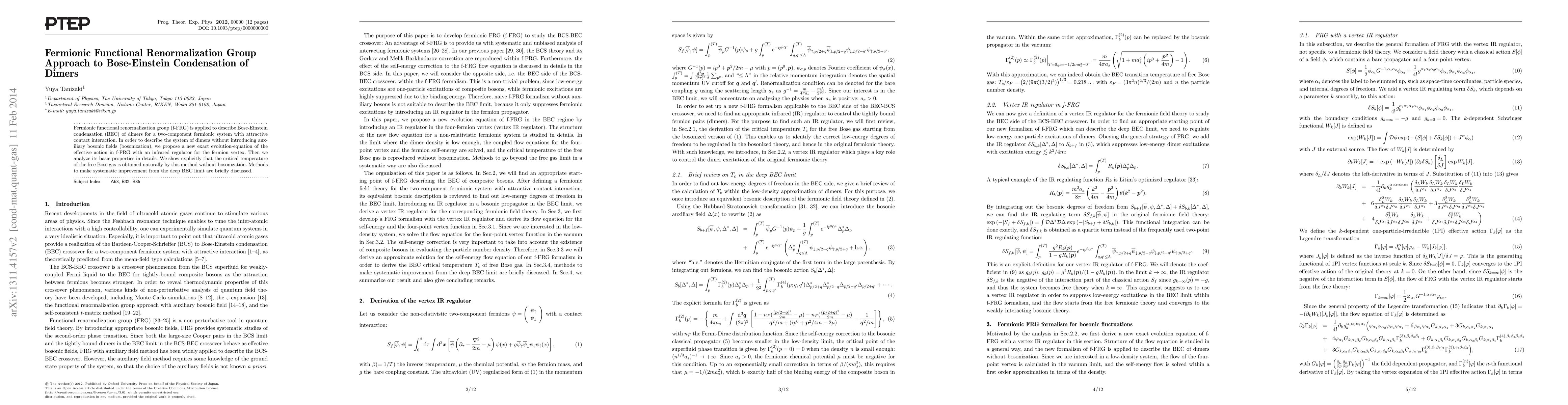 This paper applies a fermionic functional renormalization group approach to study Bose-Einstein condensation of dimers in a two-component fermionic system with attractive interactions. The authors propose a new exact evolution-equation for the effective action, avoiding bosonization, and demonstrate that it naturally yields the critical temperature of the free Bose gas.