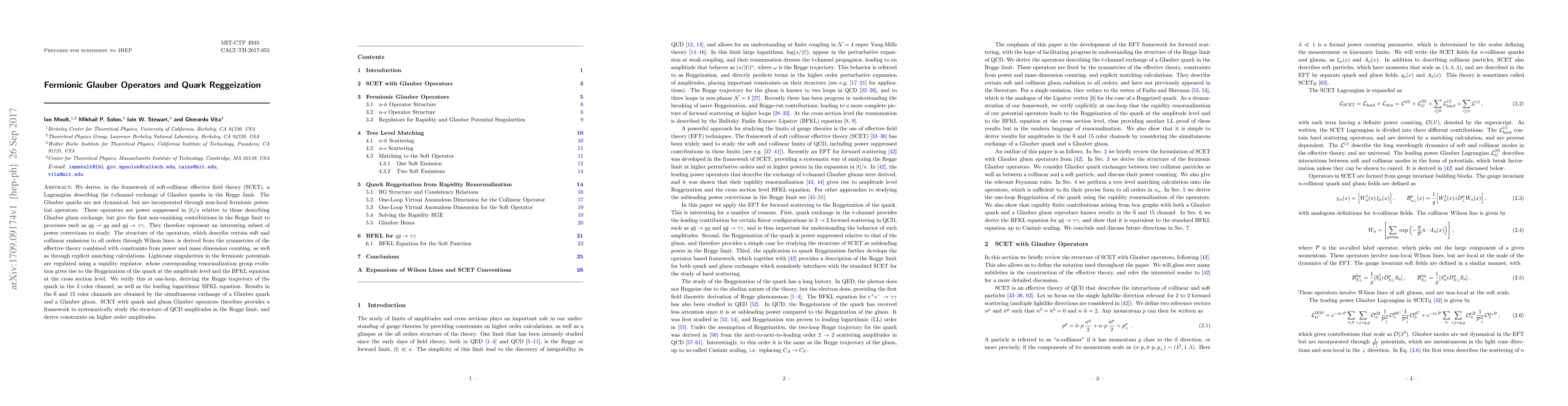 We derive, in the framework of soft-collinear effective field theory (SCET), a Lagrangian describing the $t$-channel exchange of Glauber quarks in the Regge limit. The Glauber quarks are not dynamical, but are incorporated through non-local fermionic potential operators. These operators are power suppressed in $|t|/s$ relative to those describing Glauber gluon exchange, but give the first non-vanishing contributions in the Regge limit to processes such as $q\bar q \to gg$ and $q\bar q \to \gamma \gamma$. They therefore represent an interesting subset of power corrections to study. The structure of the operators, which describe certain soft and collinear emissions to all orders through Wilson lines, is derived from the symmetries of the effective theory combined with constraints from power and mass dimension counting, as well as through explicit matching calculations. Lightcone singularities in the fermionic potentials are regulated using a rapidity regulator, whose corresponding renormalization group evolution gives rise to the Reggeization of the quark at the amplitude level and the BFKL equation at the cross section level. We verify this at one-loop, deriving the Regge trajectory of the quark in the $3$ color channel, as well as the leading logarithmic BFKL equation. Results in the $\bar 6$ and $15$ color channels are obtained by the simultaneous exchange of a Glauber quark and a Glauber gluon. SCET with quark and gluon Glauber operators therefore provides a framework to systematically study the structure of QCD amplitudes in the Regge limit, and derive constraints on higher order amplitudes.