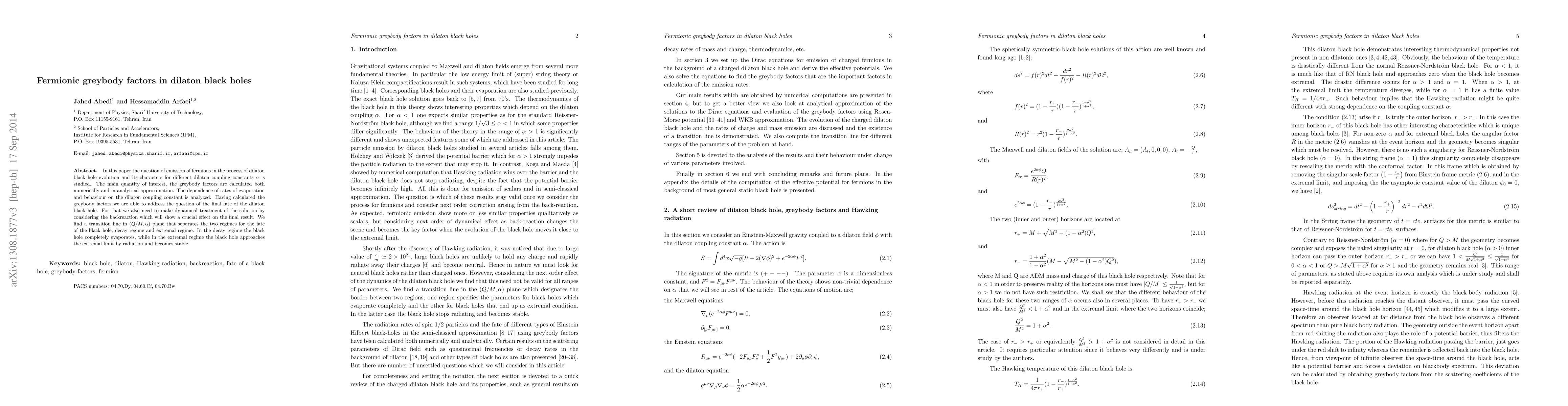 This research investigates the emission of fermions from dilaton black holes, calculating fermionic greybody factors under various dilaton coupling constants. The study finds a transition line in the $(Q/M, \alpha)$ plane that determines whether the black hole fully evaporates or stabilizes as an extremal black hole.