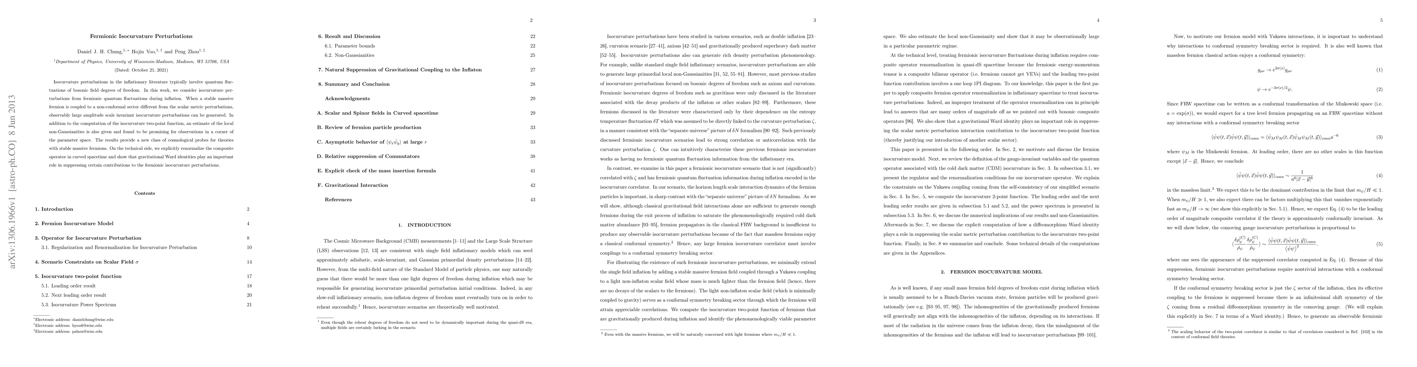 Isocurvature perturbations in the inflationary literature typically involve quantum fluctuations of bosonic field degrees of freedom. In this work, we consider isocurvature perturbations from fermionic quantum fluctuations during inflation. When a stable massive fermion is coupled to a non-conformal sector different from the scalar metric perturbations, observably large amplitude scale invariant isocurvature perturbations can be generated. In addition to the computation of the isocurvature two-point function, an estimate of the local non-Gaussianities is also given and found to be promising for observations in a corner of the parameter space. The results provide a new class of cosmological probes for theories with stable massive fermions. On the technical side, we explicitly renormalize the composite operator in curved spacetime and show that gravitational Ward identities play an important role in suppressing certain contributions to the fermionic isocurvature perturbations.