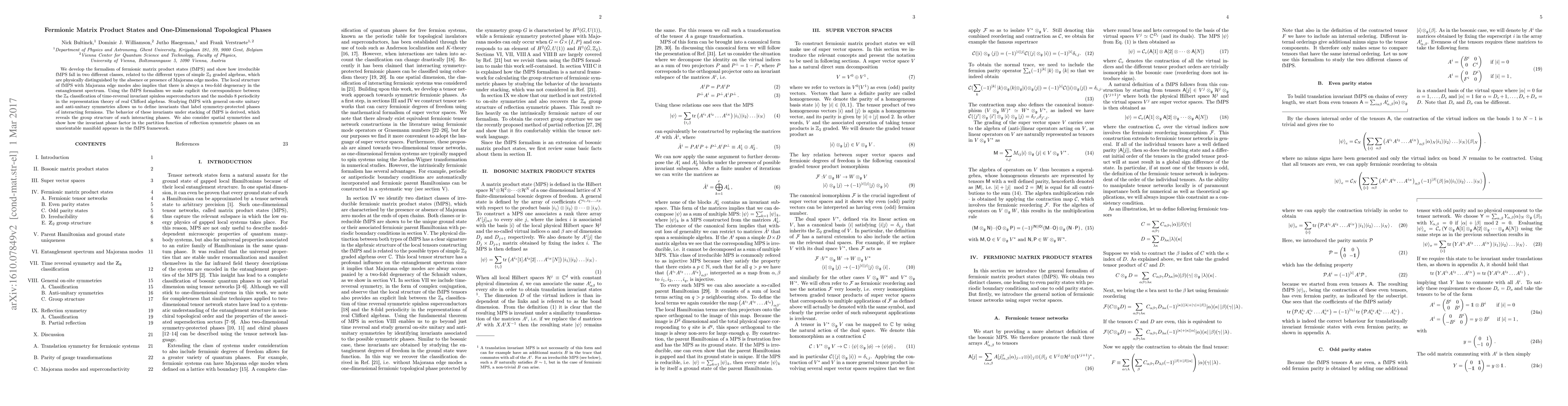 The development of the fMPS formalism for fermionic systems and its application to classify one-dimensional topological phases based on symmetries and entanglement properties.