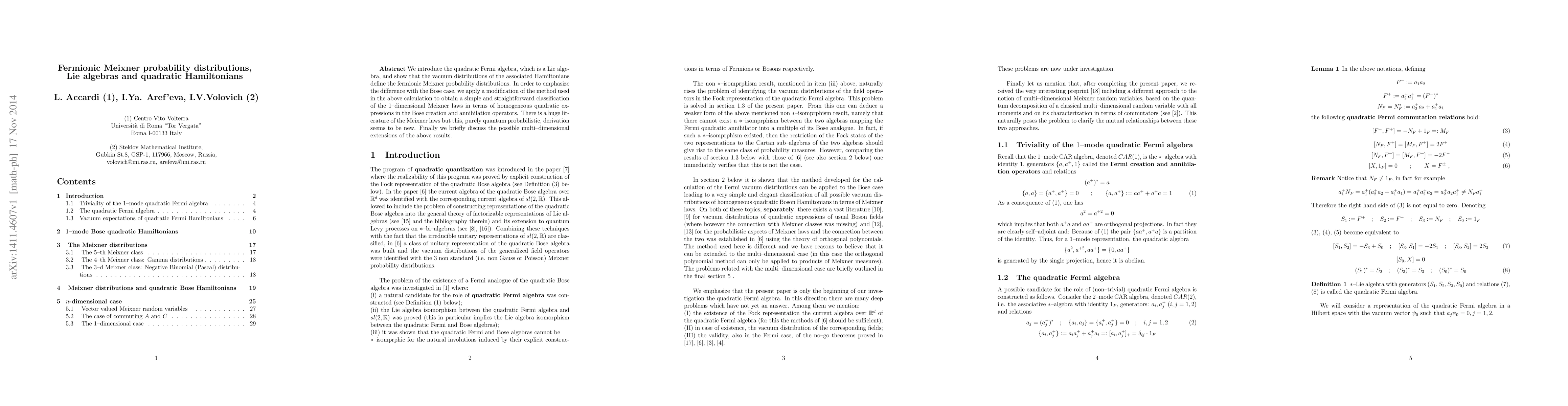 We introduce the quadratic Fermi algebra, which is a Lie algebra, and show that the vacuum distributions of the associated Hamiltonians define the fermionic Meixner probability distributions. In order to emphasize the difference with the Bose case, we apply a modification of the method used in the above calculation to obtain a simple and straightforward classification of the 1--dimensional Meixner laws in terms of homogeneous quadratic expressions in the Bose creation and annihilation operators. There is a huge literature of the Meixner laws but this, purely quantum probabilistic, derivation seems to be new. Finally we briefly discuss the possible multi-dimensional extensions of the above results.