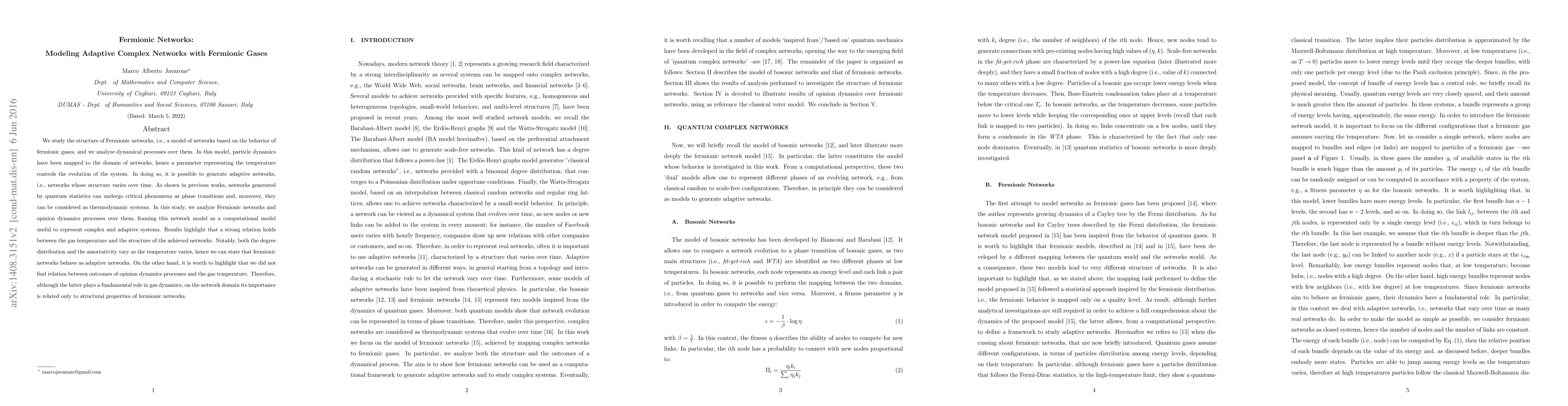 We study the structure of Fermionic networks, i.e., a model of networks based on the behavior of fermionic gases, and we analyze dynamical processes over them. In this model, particle dynamics have been mapped to the domain of networks, hence a parameter representing the temperature controls the evolution of the system. In doing so, it is possible to generate adaptive networks, i.e., networks whose structure varies over time. As shown in previous works, networks generated by quantum statistics can undergo critical phenomena as phase transitions and, moreover, they can be considered as thermodynamic systems. In this study, we analyze Fermionic networks and opinion dynamics processes over them, framing this network model as a computational model useful to represent complex and adaptive systems. Results highlight that a strong relation holds between the gas temperature and the structure of the achieved networks. Notably, both the degree distribution and the assortativity vary as the temperature varies, hence we can state that fermionic networks behave as adaptive networks. On the other hand, it is worth to highlight that we did not find relation between outcomes of opinion dynamics processes and the gas temperature. Therefore, although the latter plays a fundamental role in gas dynamics, on the network domain its importance is related only to structural properties of fermionic networks.