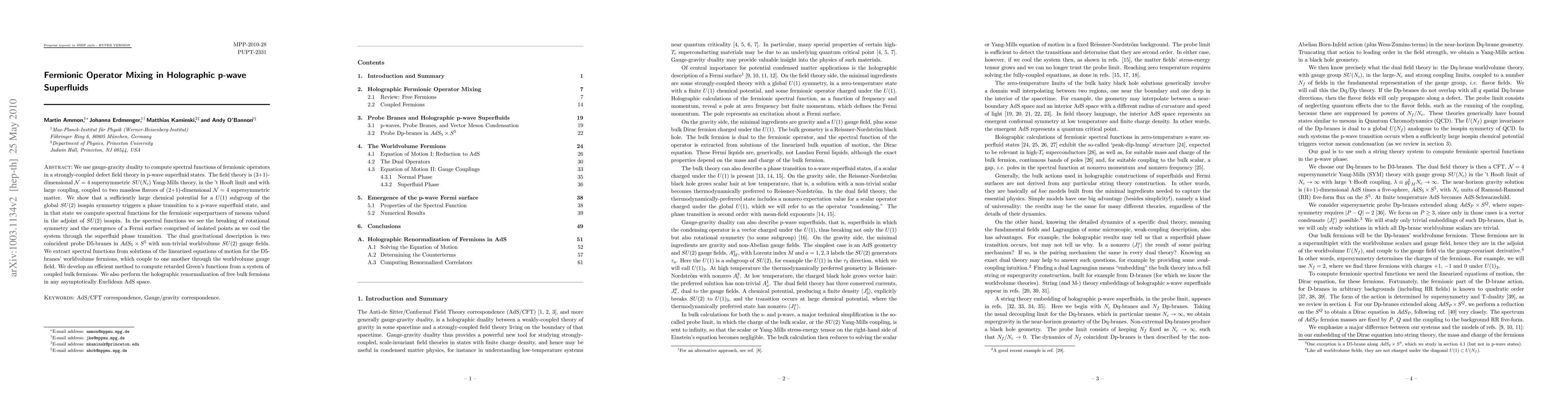 We use gauge-gravity duality to compute spectral functions of fermionic operators in a strongly-coupled defect field theory in p-wave superfluid states. The field theory is (3+1)-dimensional N=4 supersymmetric SU(Nc) Yang-Mills theory, in the 't Hooft limit and with large coupling, coupled to two massless flavors of (2+1)-dimensional N=4 supersymmetric matter. We show that a sufficiently large chemical potential for a U(1) subgroup of the global SU(2) isospin symmetry triggers a phase transition to a p-wave superfluid state, and in that state we compute spectral functions for the fermionic superpartners of mesons valued in the adjoint of SU(2) isospin. In the spectral functions we see the breaking of rotational symmetry and the emergence of a Fermi surface comprised of isolated points as we cool the system through the superfluid phase transition. The dual gravitational description is two coincident probe D5-branes in AdS5 x S5 with non-trivial worldvolume SU(2) gauge fields. We extract spectral functions from solutions of the linearized equations of motion for the D5-branes' worldvolume fermions, which couple to one another through the worldvolume gauge field. We develop an efficient method to compute retarded Green's functions from a system of coupled bulk fermions. We also perform the holographic renormalization of free bulk fermions in any asymptotically Euclidean AdS space.