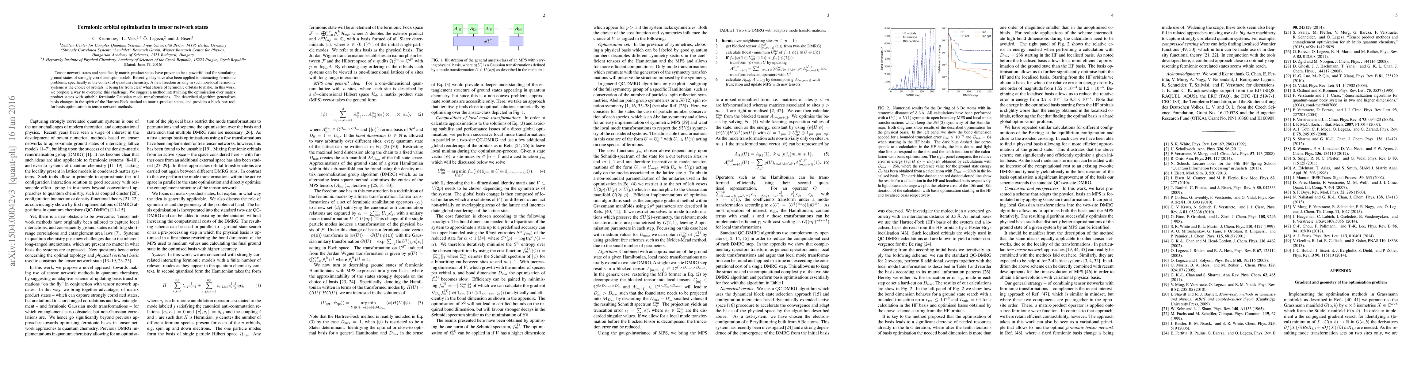 This paper proposes a method to optimize fermionic orbitals in tensor network states, specifically matrix-product states, by integrating orbital transformations with the optimization process. The approach generalizes basis changes akin to the Hartree-Fock method, offering a tool for automated orbital optimization in quantum chemistry simulations.