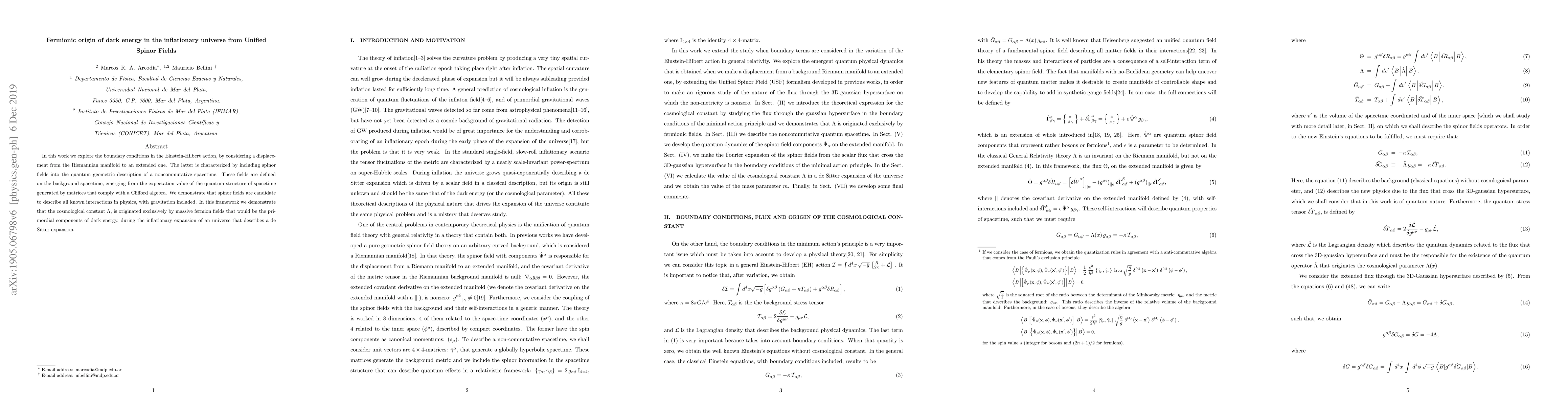 In this work we explore the boundary conditions in the Einstein-Hilbert action, by considering a displacement from the Riemannian manifold to an extended one. The latter is characterized by including spinor fields into the quantum geometric description of a noncommutative spacetime. These fields are defined on the background spacetime, emerging from the expectation value of the quantum structure of spacetime generated by matrices that comply with a Clifford algebra. We demonstrate that spinor fields are candidate to describe all known interactions in physics, with gravitation included. In this framework we demonstrate that the cosmological constant $\Lambda$, is originated exclusively by massive fermion fields that would be the primordial components of dark energy, during the inflationary expansion of an universe that describes a de Sitter expansion.