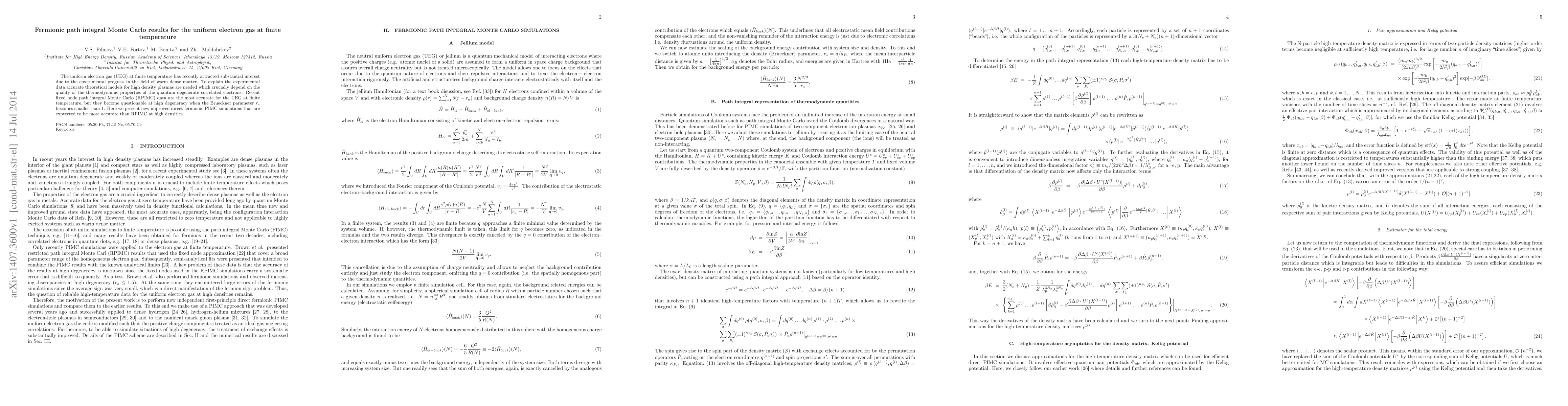 The uniform electron gas (UEG) at finite temperature has recently attracted substantial interest due to the epxerimental progress in the field of warm dense matter. To explain the experimental data accurate theoretical models for high density plasmas are needed which crucially depend on the quality of the thermodynamic properties of the quantum degenerate correlated electrons. Recent fixed node path integral Monte Carlo (RPIMC) data are the most accurate for the UEG at finite temperature, but they become questionable at high degeneracy when the Brueckner parameter $r_s$ becomes smaller than $1$. Here we present new improved direct fermionic PIMC simulations that are exptected to be more accurate than RPIMC at high densities.