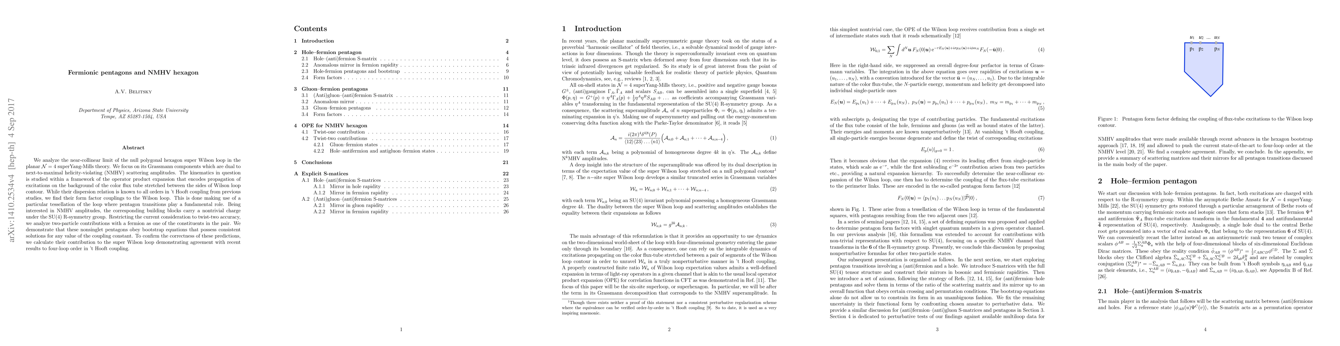 We analyze the near-collinear limit of the null polygonal hexagon super Wilson loop in the planar N = 4 superYang-Mills theory. We focus on its Grassmann components which are dual to next-to-maximal helicity-violating (NMHV) scattering amplitudes. The kinematics in question is studied within a framework of the operator product expansion that encodes propagation of excitations on the background of the color flux tube stretched between the sides of Wilson loop contour. While their dispersion relation is known to all orders in 't Hooft coupling from previous studies, we find their form factor couplings to the Wilson loop. This is done making use of a particular tessellation of the loop where pentagon transitions play a fundamental role. Being interested in NMHV amplitudes, the corresponding building blocks carry a nontrivial charge under the SU(4) R-symmetry group. Restricting the current consideration to twist-two accuracy, we analyze two-particle contributions with a fermion as one of the constituents in the pair. We demonstrate that these nonsinglet pentagons obey bootstrap equations that possess consistent solutions for any value of the coupling constant. To confirm the correctness of these predictions, we calculate their contribution to the super Wilson loop demonstrating agreement with recent results to four-loop order in 't Hooft coupling.