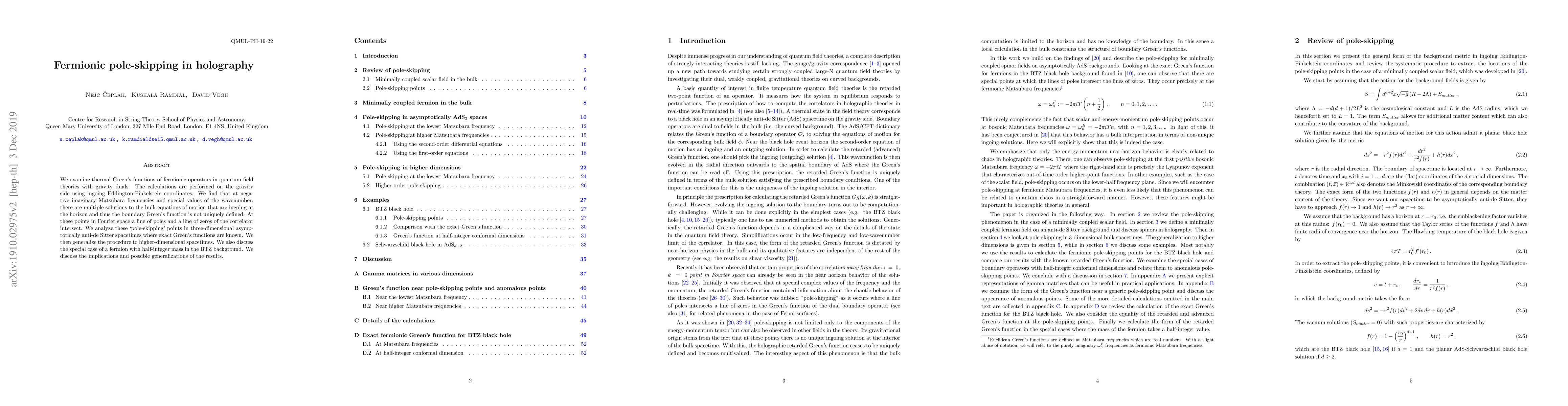 We examine thermal Green's functions of fermionic operators in quantum field theories with gravity duals. The calculations are performed on the gravity side using ingoing Eddington-Finkelstein coordinates. We find that at negative imaginary Matsubara frequencies and special values of the wavenumber, there are multiple solutions to the bulk equations of motion that are ingoing at the horizon and thus the boundary Green's function is not uniquely defined. At these points in Fourier space a line of poles and a line of zeros of the correlator intersect. We analyze these `pole-skipping' points in three-dimensional asymptotically anti-de Sitter spacetimes where exact Green's functions are known. We then generalize the procedure to higher-dimensional spacetimes. We also discuss the special case of a fermion with half-integer mass in the BTZ background. We discuss the implications and possible generalizations of the results.