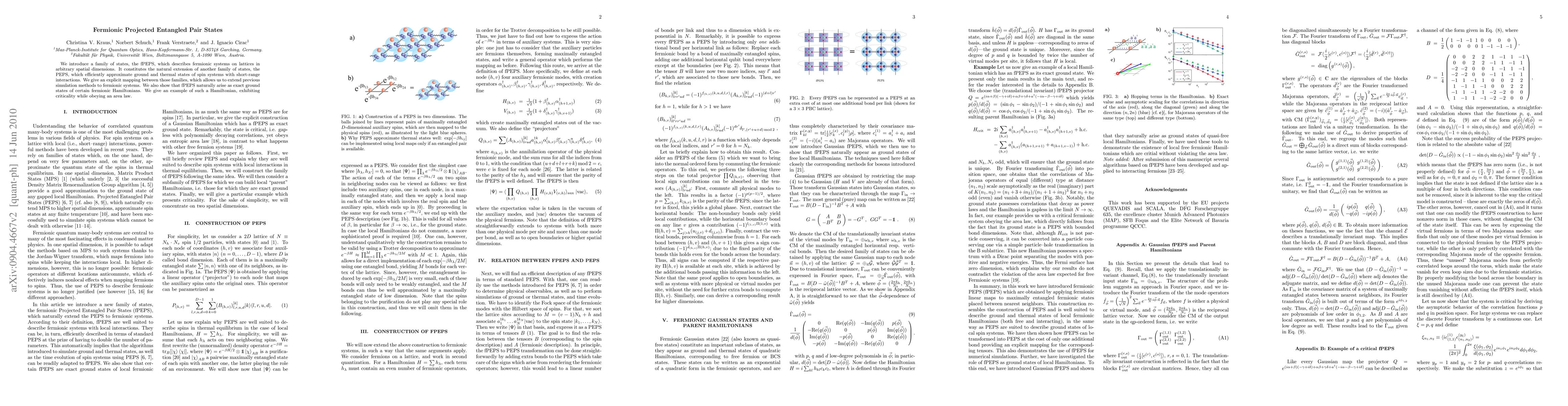 We introduce a family of states, the fPEPS, which describes fermionic systems on lattices in arbitrary spatial dimensions. It constitutes the natural extension of another family of states, the PEPS, which efficiently approximate ground and thermal states of spin systems with short-range interactions. We give an explicit mapping between those families, which allows us to extend previous simulation methods to fermionic systems. We also show that fPEPS naturally arise as exact ground states of certain fermionic Hamiltonians. We give an example of such a Hamiltonian, exhibiting criticality while obeying an area law.
