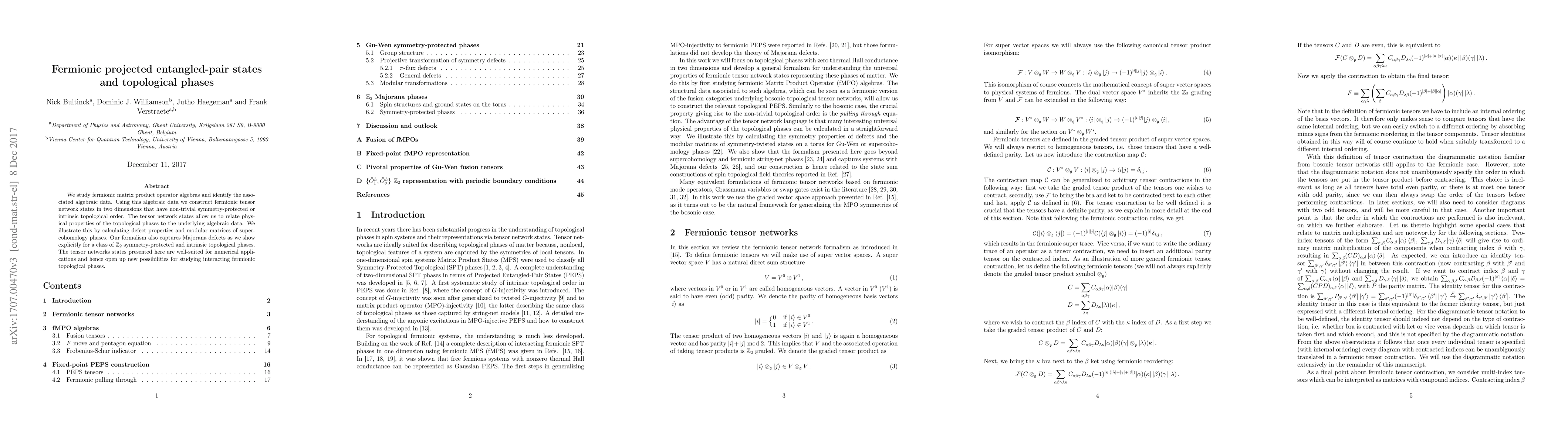 This paper constructs fermionic tensor network states exhibiting non-trivial topological order, linking their physical properties to underlying algebraic data and demonstrating the formalism’s applicability to Majorana defects and $\mathbb{Z}_2$ symmetry-protected phases, thus offering new avenues for numerical studies of fermionic topological phases.