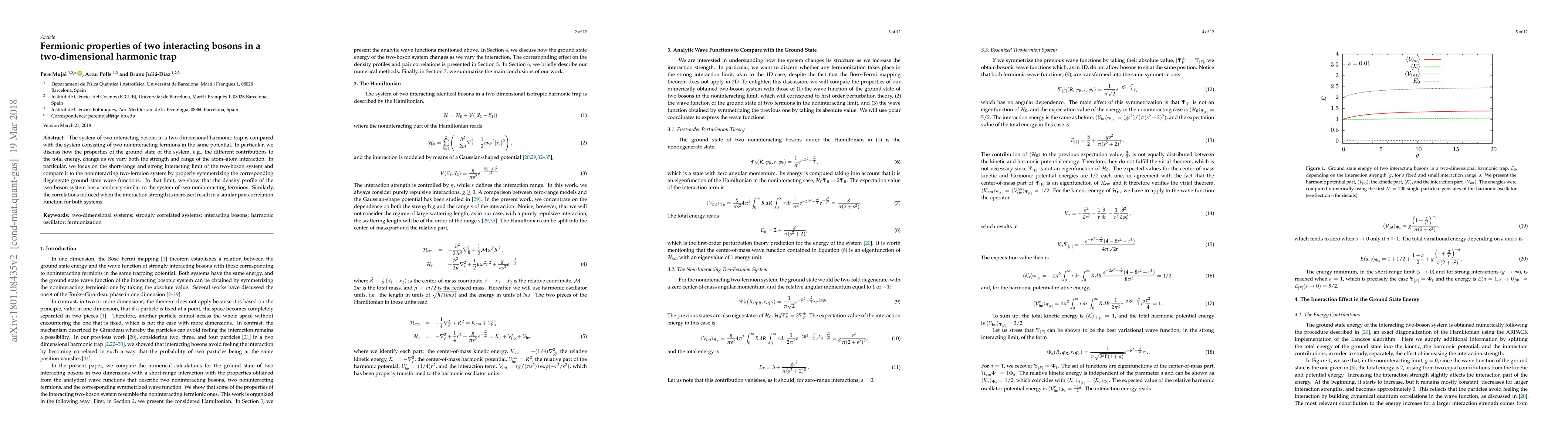 This paper investigates the fermionic properties of two interacting bosons in a two-dimensional harmonic trap, comparing them to a system of two noninteracting fermions. It finds that in the strong interaction limit, the density profile and pair correlation function of the two-boson system resemble those of the noninteracting two-fermion system.