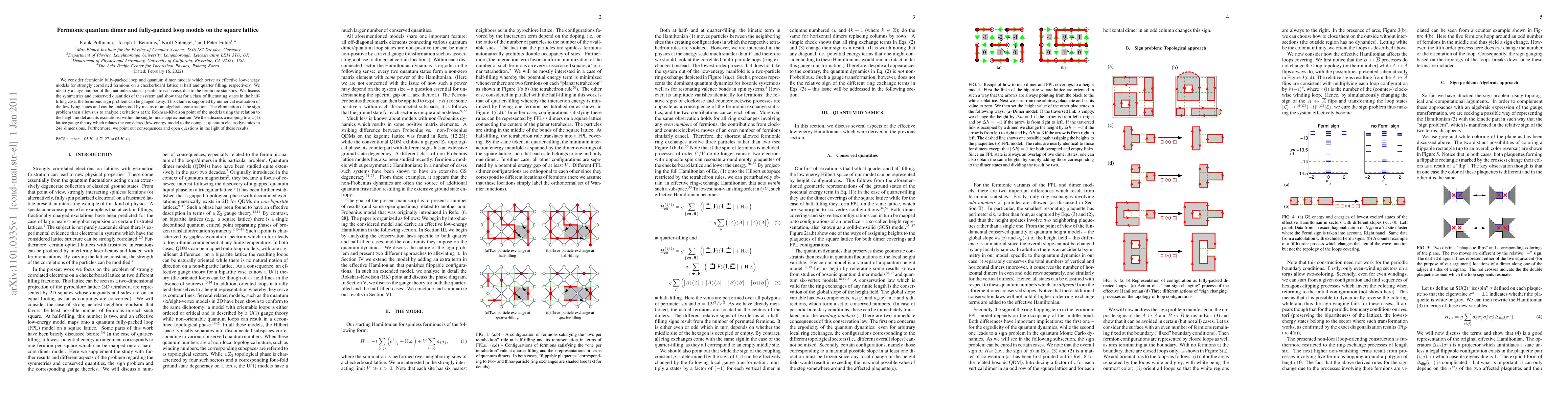 We consider fermionic fully-packed loop and quantum dimer models which serve as effective low-energy models for strongly correlated fermions on a checkerboard lattice at half and quarter filling, respectively. We identify a large number of fluctuationless states specific to each case, due to the fermionic statistics. We discuss the symmetries and conserved quantities of the system and show that for a class of fluctuating states in the half-filling case, the fermionic sign problem can be gauged away. This claim is supported by numerical evaluation of the low-lying states and can be understood by means of an algebraic construction. The elimination of the sign problem then allows us to analyze excitations at the Rokhsar-Kivelson point of the models using the relation to the height model and its excitations, within the single-mode approximation. We then discuss a mapping to a U(1) lattice gauge theory which relates the considered low-energy model to the compact quantum electrodynamics in 2+1 dimensions. Furthermore, we point out consequences and open questions in the light of these results.