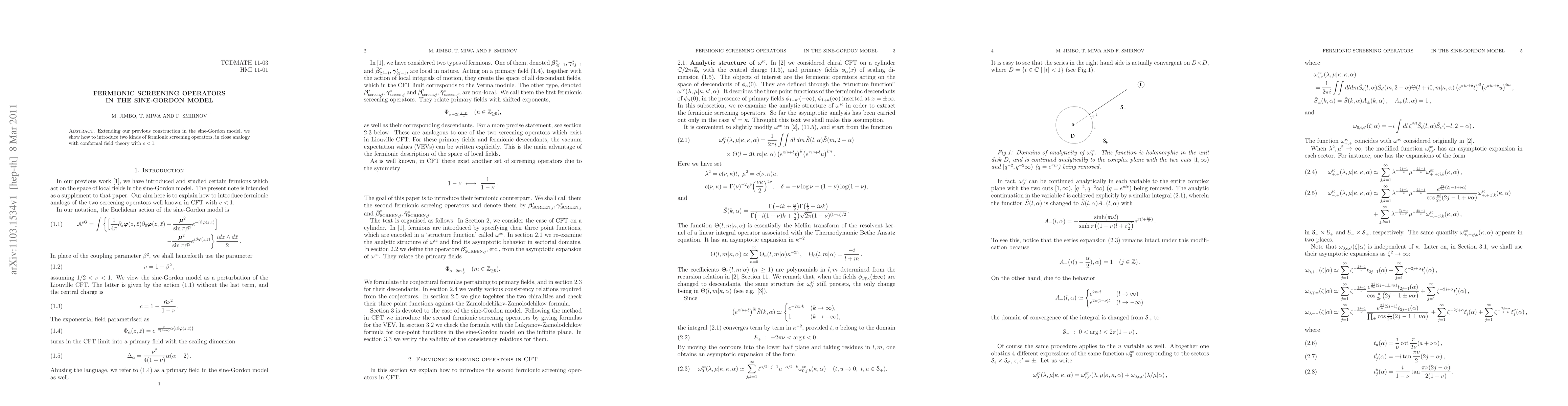 Summary: This paper extends previous work on the sine-Gordon model to introduce two types of fermionic screening operators, drawing parallels with conformal field theory featuring c<1, thereby enriching the model's analytical framework.