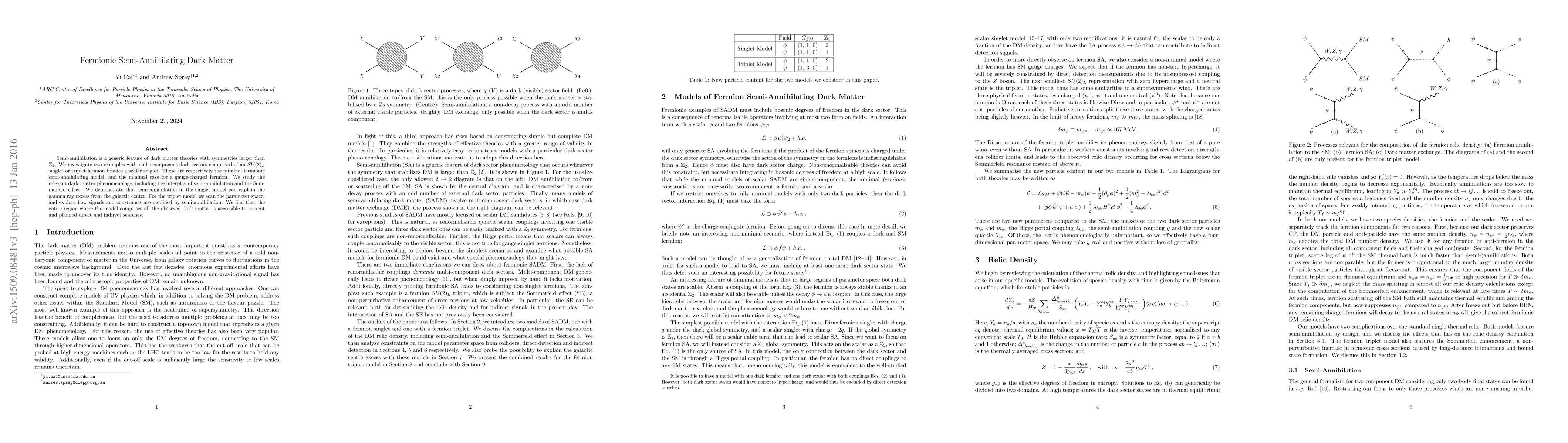 Semi-annihilation is a generic feature of dark matter theories with symmetries larger than Z2. We investigate two examples with multi-component dark sectors comprised of an SU(2)L singlet or triplet fermion besides a scalar singlet. These are respectively the minimal fermionic semi-annihilating model, and the minimal case for a gauge-charged fermion. We study the relevant dark matter phenomenology, including the interplay of semi-annihilation and the Sommerfeld effect. We demonstrate that semi-annihilation in the singlet model can explain the gamma ray excess from the galactic center. For the triplet model we scan the parameter space, and explore how signals and constraints are modified by semi-annihilation. We find that the entire region where the model comprises all the observed dark matter is accessible to current and planned direct and indirect searches.
