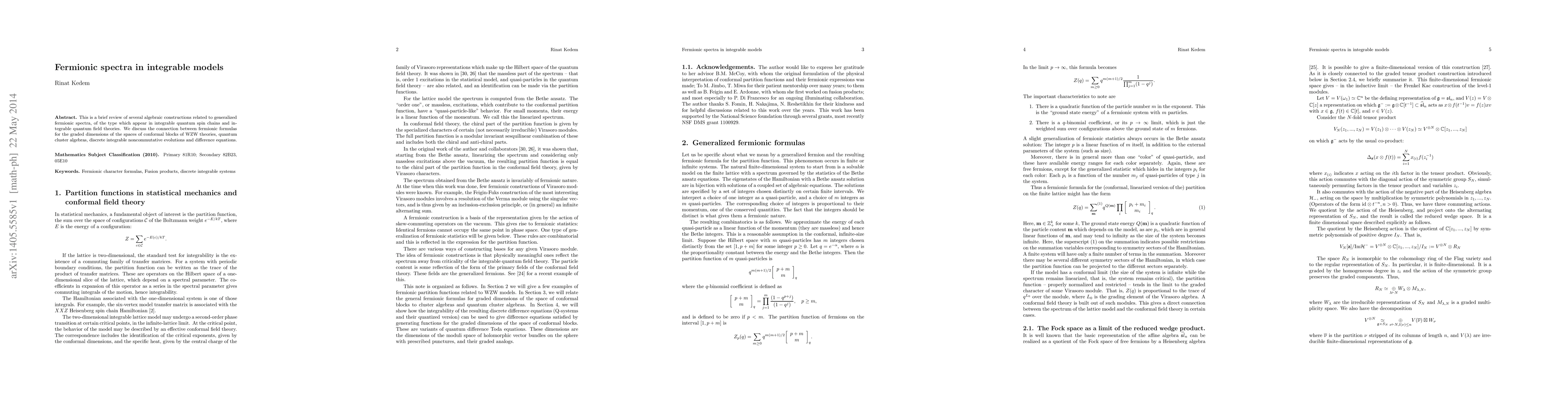 This paper reviews algebraic methods for studying fermionic spectra in integrable quantum systems, focusing on connections between conformal blocks, WZW theories, quantum cluster algebras, and integrable evolutions. The emphasis is on understanding the graded dimensions of conformal blocks via fermionic formulas.