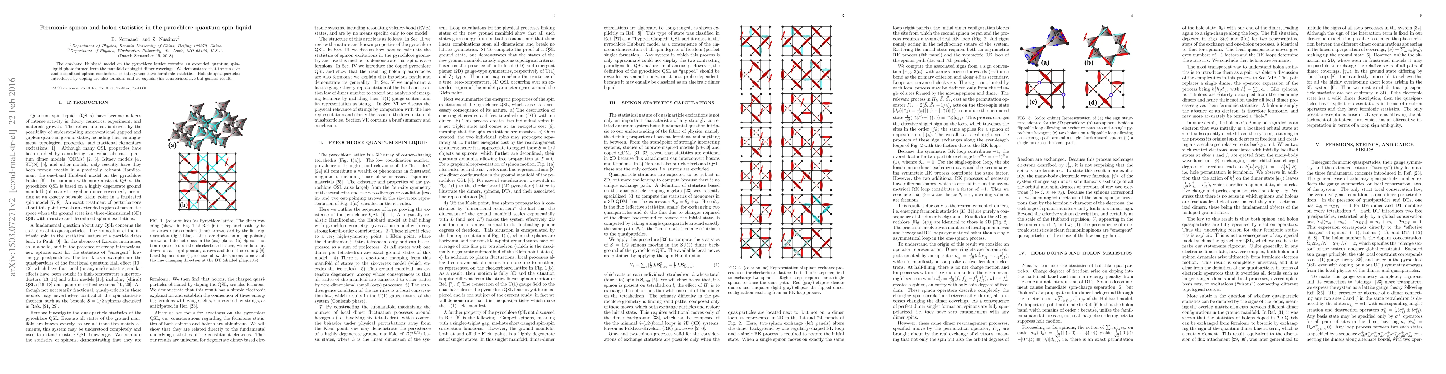 The one-band Hubbard model on the pyrochlore lattice contains an extended quantum spin-liquid phase formed from the manifold of singlet dimer coverings. We demonstrate that the massive and deconfined spinon excitations of this system have fermionic statistics. Holonic quasiparticles introduced by doping are also fermions and we explain the origin of this counterintuitive result.