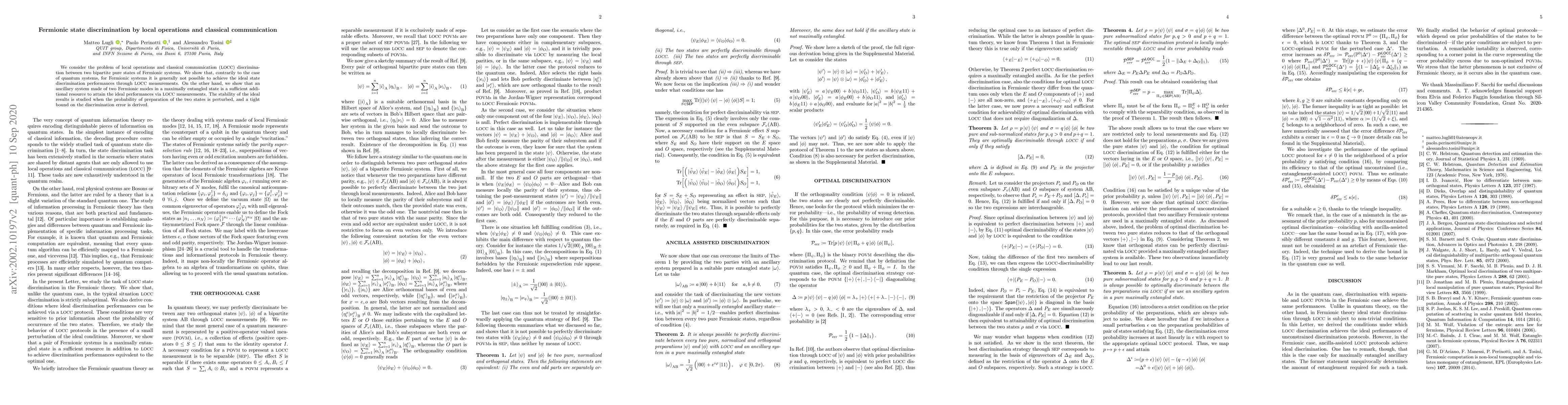 This paper investigates the discrimination of two bipartite fermionic pure states using local operations and classical communication (LOCC). It finds that ideal state discrimination is generally unattainable for fermionic systems via LOCC alone, but becomes possible with an ancillary system of two maximally entangled fermionic modes. The stability of this ideal performance under preparation errors is also analyzed.