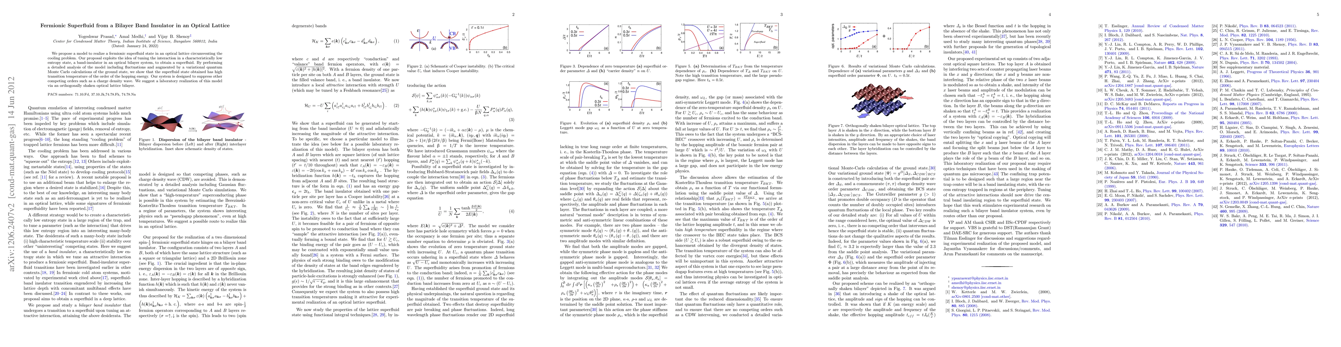 This paper proposes a model for achieving a fermionic superfluid state in an optical lattice by tuning interactions in a bilayer band insulator, demonstrating high transition temperatures via quantum Monte Carlo calculations, and suggests its realization using an orthogonally shaken optical lattice bilayer. The system aims to suppress competing orders like charge density waves.