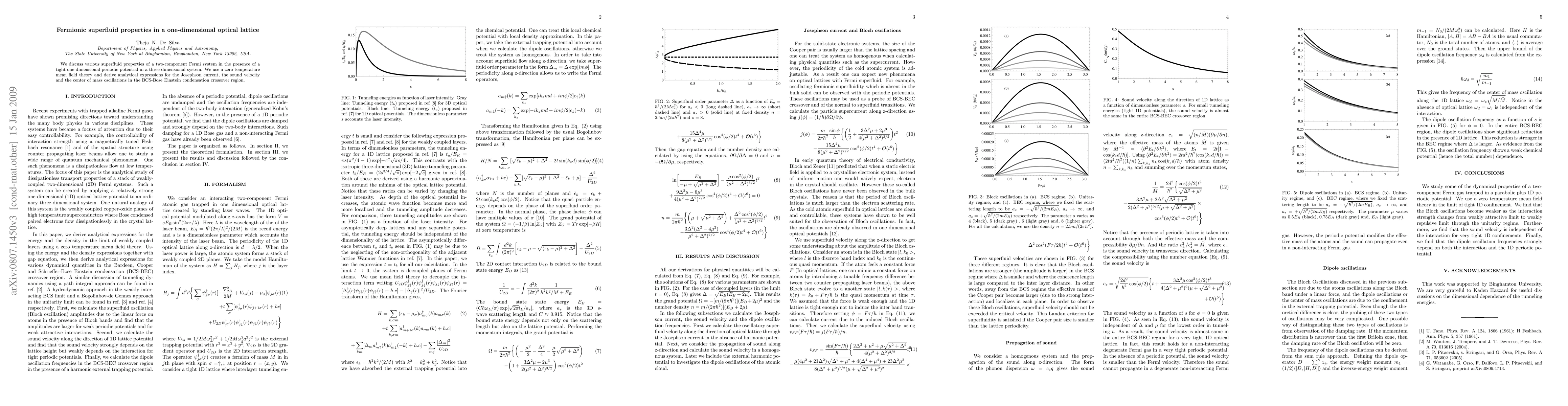 This research explores the superfluid characteristics of a two-component Fermi system confined in a 1D optical lattice using mean field theory at absolute zero. It provides analytical expressions for Josephson current, sound velocity, and center of mass oscillations across the BCS-BEC crossover.