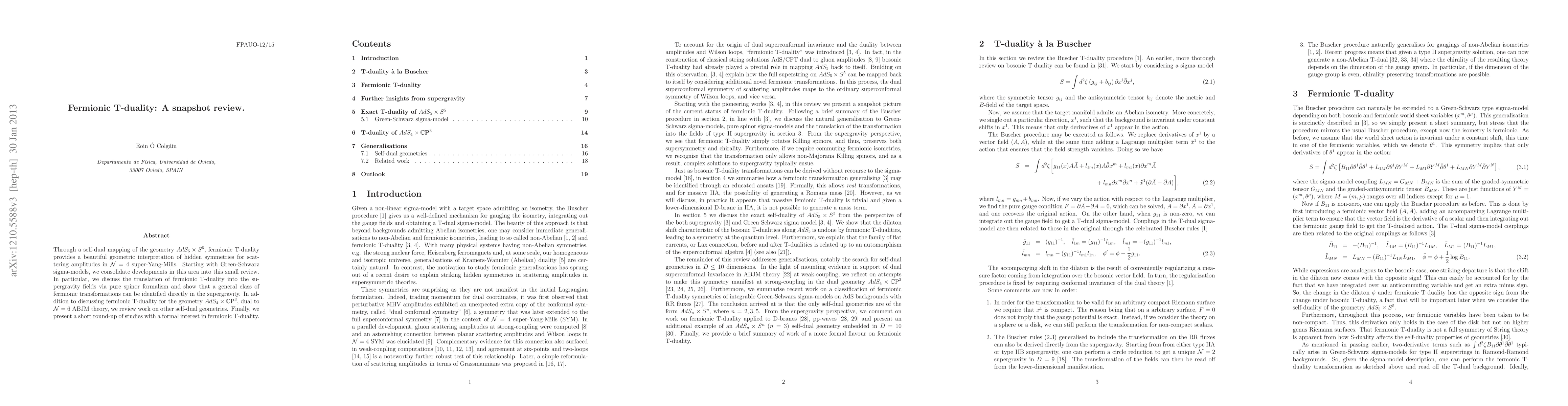 Through a self-dual mapping of the geometry AdS5 x S5, fermionic T-duality provides a beautiful geometric interpretation of hidden symmetries for scattering amplitudes in N=4 super-Yang-Mills. Starting with Green-Schwarz sigma-models, we consolidate developments in this area into this small review. In particular, we discuss the translation of fermionic T-duality into the supergravity fields via pure spinor formalism and show that a general class of fermionic transformations can be identified directly in the supergravity. In addition to discussing fermionic T-duality for the geometry AdS4 x CP3, dual to N=6 ABJM theory, we review work on other self-dual geometries. Finally, we present a short round-up of studies with a formal interest in fermionic T-duality.