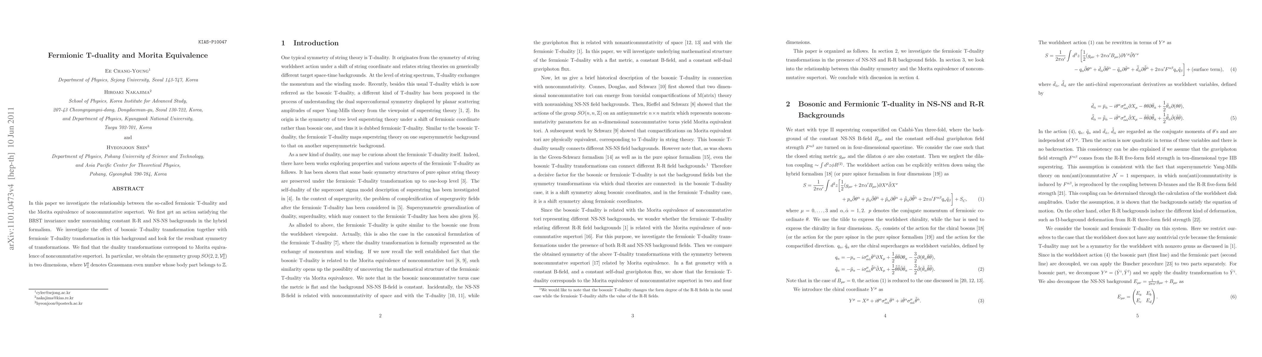 This paper explores the connection between fermionic T-duality and Morita equivalence in noncommutative supertori, revealing that these transformations correspond to Morita equivalence. The study finds the symmetry group $SO(2,2,{\cal V}_{\Z}^0)$ in two dimensions, linking the duality transformations to the algebraic structure of Grassmann even numbers.
